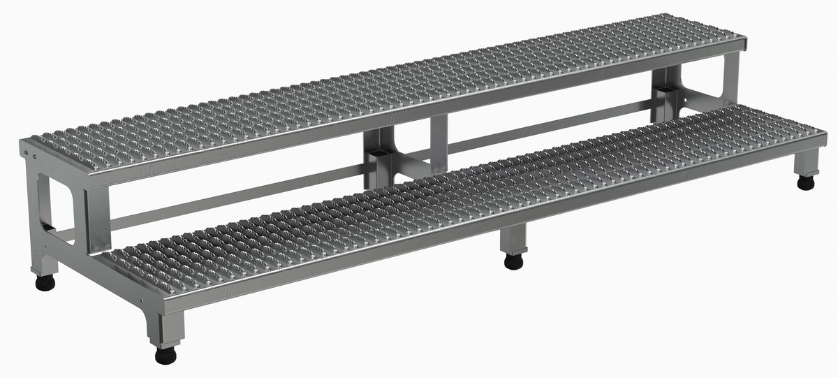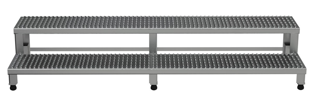 Aluminum Adjustable Step Mate Stand 2 Step 22-3/4 In. x 72-1/8 In. x 14-1/2 In. 500 Lb. Capacity SilverThe adjustable step-mate stand can be used as either a comfortable worker platform or a semi-permanent step. The serrated surface ensures safe footing. The legs adjust individually by screwing them into or out of the leg base.