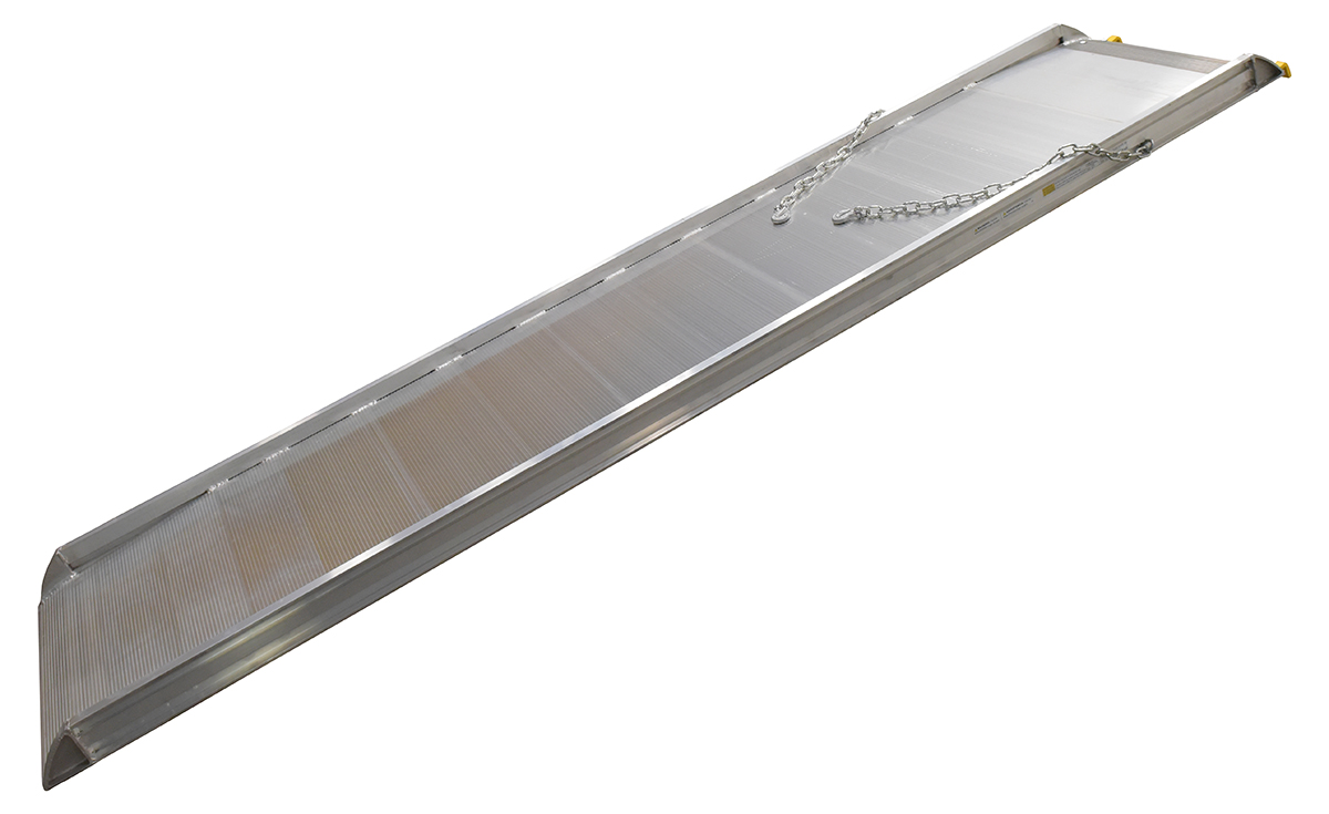 Aluminum Wheel Walk Ramp Steel Hook Style 123-1/16 In. x 28 In. 2200 Lb. Capacity SilverThe Aluminum Walk Ramp enables delivery men/women, shippers, and receivers to load and unload trucks when docks are unavailable. Heavy-duty steel chains with steel grab hooks are attaches to each side of ramp for safely securing ramp to truck. Constructed of strong aluminum alloy with non-skid tread surface. The ramp is lightweight and easy to handle. This steel hook style mounts onto the truck extensions.