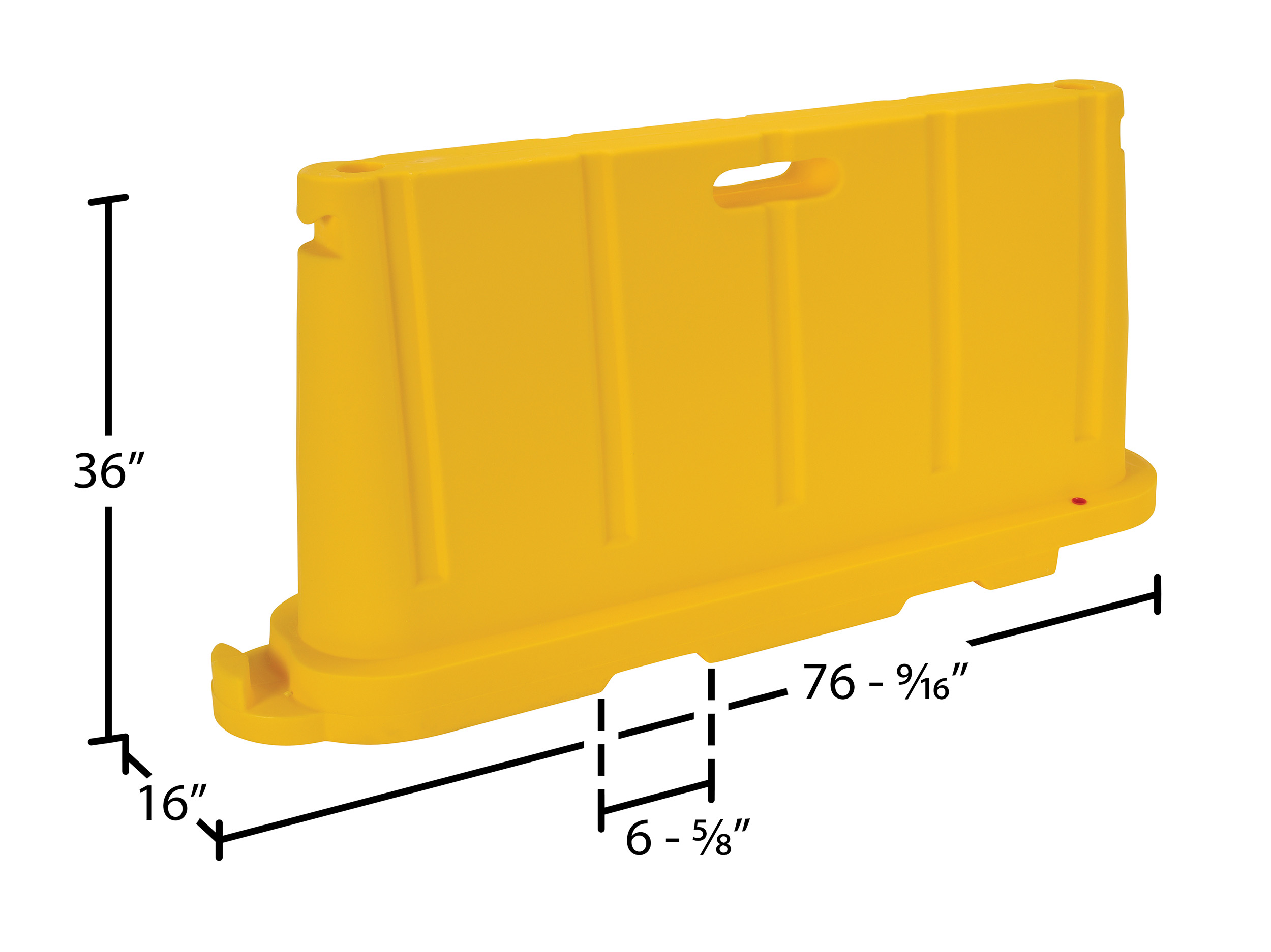 Polyethylene Stackable Barricade 76-1/2 In. x 16 In. x 36 In. YellowThe portable barrier is ideal for traffic and crowd control. The unit can be filled with water or sand for added security. The barriers have additional forklift slots on the bottom of the unit for easy transportation and can be stacked during storage for extra space. Special colors and custom mold in graphic labeling is available upon request.