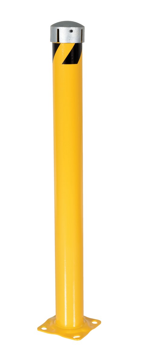 Steel Pipe Bollard with Removable Bolt-On Steel Cap and Slots 48 In. x 4-1/2 In. YellowCreate barriers around workstations, machinery, and outdoor space with steel pipe bollard with chain slots. Ideal for indoor and outdoor applications. Easy to assemble. Removable bolt-on steel top cap with socket set-screw. Place chain into chain slots, storing any excess chain inside the bollard, and place cap back onto bollard. The chain slots hold chain connected to other bollards. Base plate includes pre-drilled bollard. Heavy duty welded steel construction. Powder coat safety yellow finish.