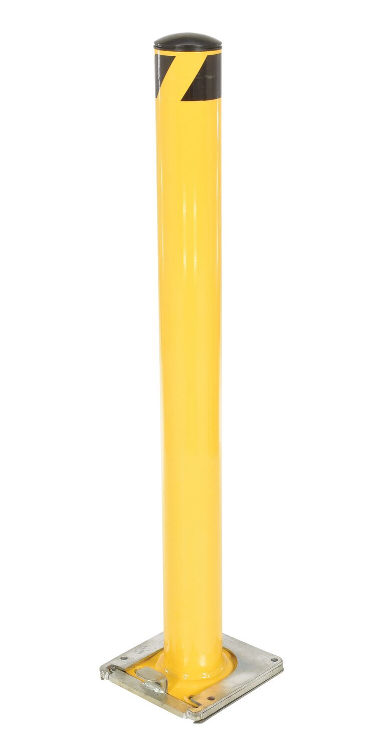 Steel Surface Mounted Removable Pipe Safety Bollard 48 In. x 4-1/2 In. YellowThis steel pipe safety bollard can be used both indoors and outdoors to protect work areas, racking and personnel. Surface mounted steel base plate allows for quick and easy bollard removal. Steel base plate is bolted in place. Guard is easily inserted into base plate then locked in place. Base plate includes pre-drilled mounting holes. Plastic caps are removable. Powder coated safety yellow finish. Welded steel construction.