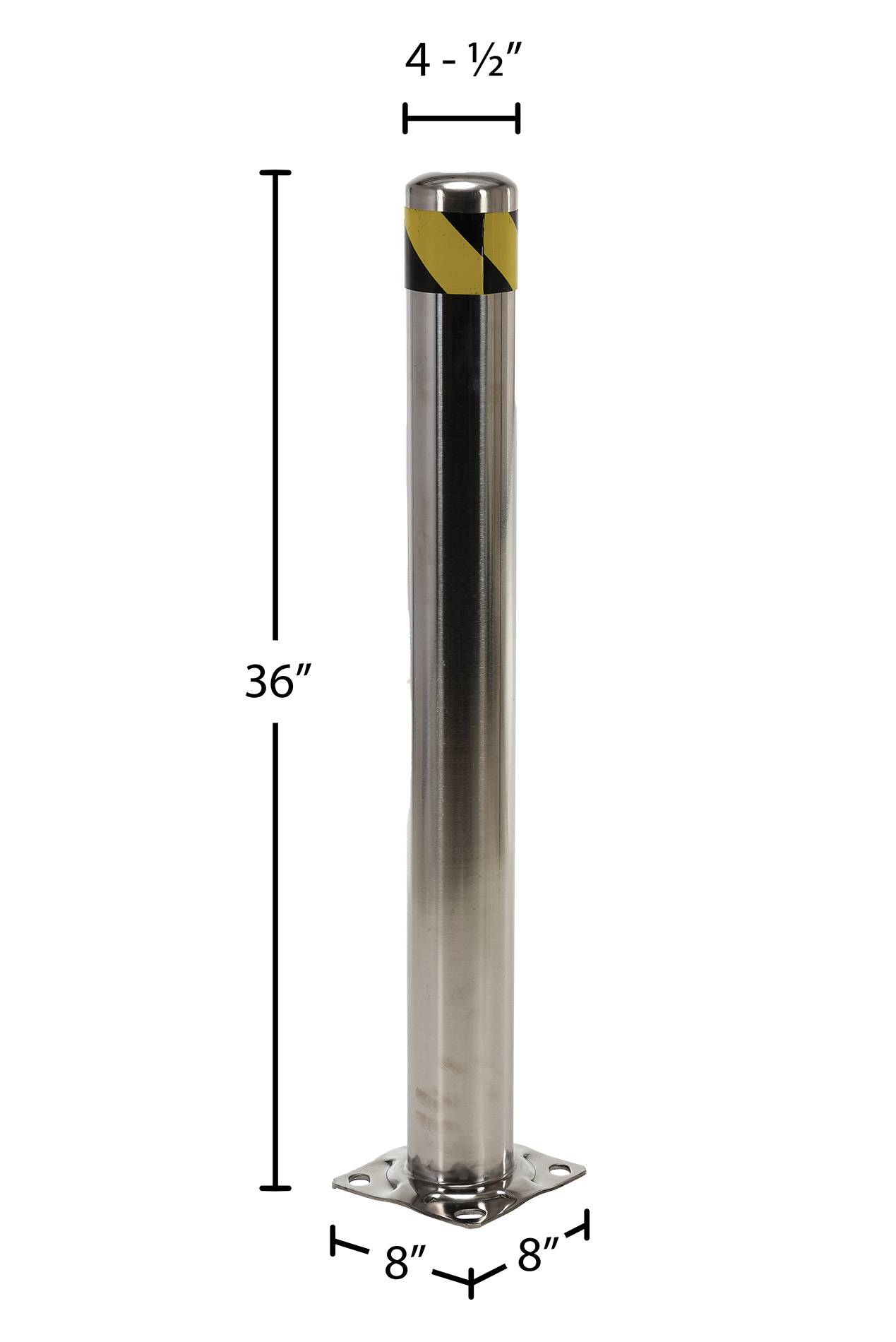 Stainless Steel Pipe Safety Bollard 36 In. x 4-1/2 In. SilverThe Stainless Steel pipe safety bollard protects work areas, racking and personnel. Stainless Steel caps are welded on. Base plate is welded on. (Mounting hardware not included).