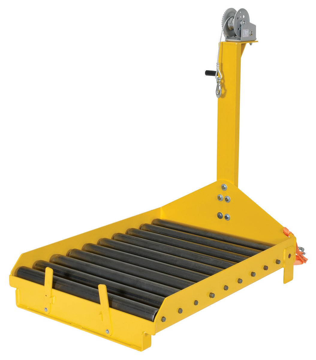 The battery transfer platform with winch features a roller deck for easy battery movement with the use of a pallet truck. The front locking safety tabs secure battery in platform. The unit has a welded steel construction with a powder coat yellow finish. Winch attachment can be installed easily to the battery transfer carts with the supplied hardware. The manual winch is designed to pull battery out of fork truck.