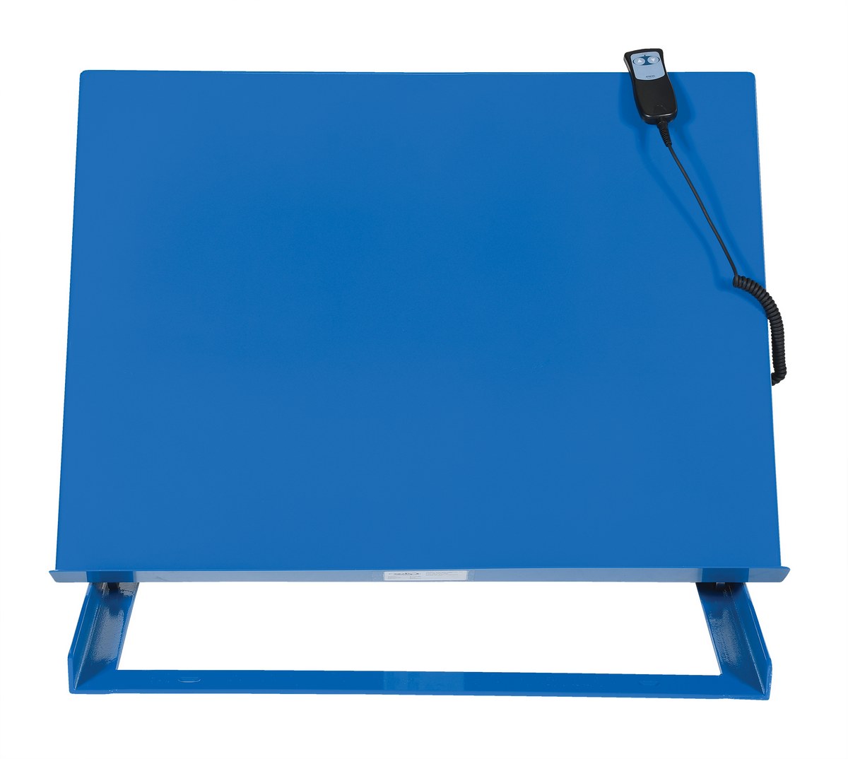Linear Bench Top Tilter 28 In. x 36 In. 500 Lb. Capacity BlueThe heavy-duty bench top tilter easily attaches to most industrial table tops, work benches, and mobile lift tables of sufficient load capacity and surface size. The unit slides back as it tilts to maintain the center of gravity over the frame. Manual units can be adjusted only when unloaded and the linear actuated units are equipped with a push-button hand pendant control. The flat base plate has slotted holes for installation.