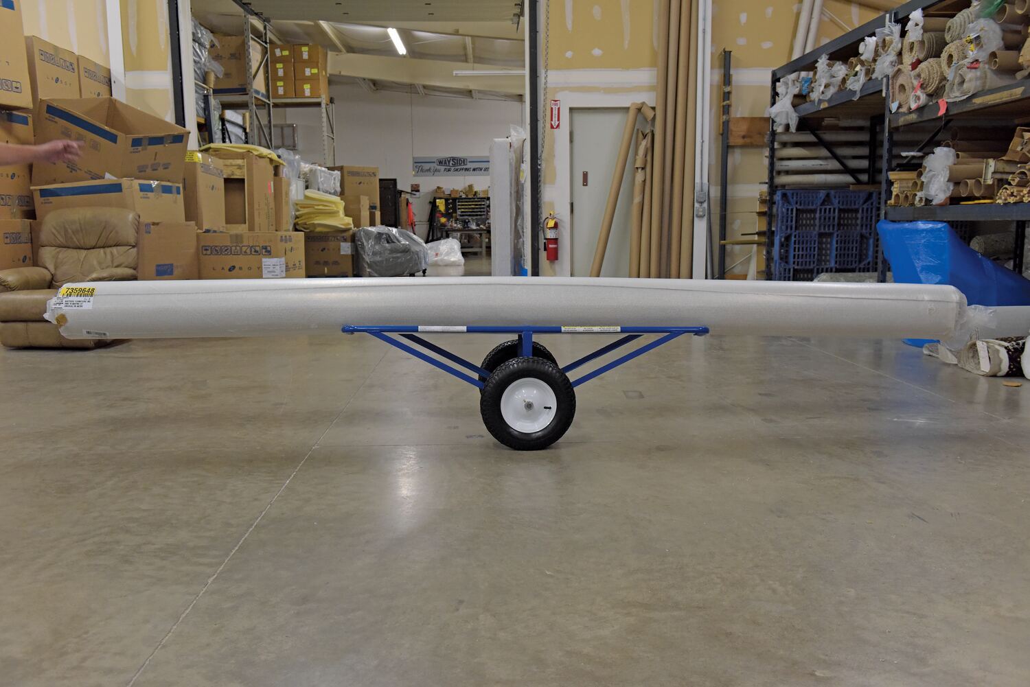 This portable carpet dolly allows for easy movement of long and heavy rolls of carpeting. V-groove platform holds carpet rolls securely in place. Welded steel construction with powder coat blue finish.