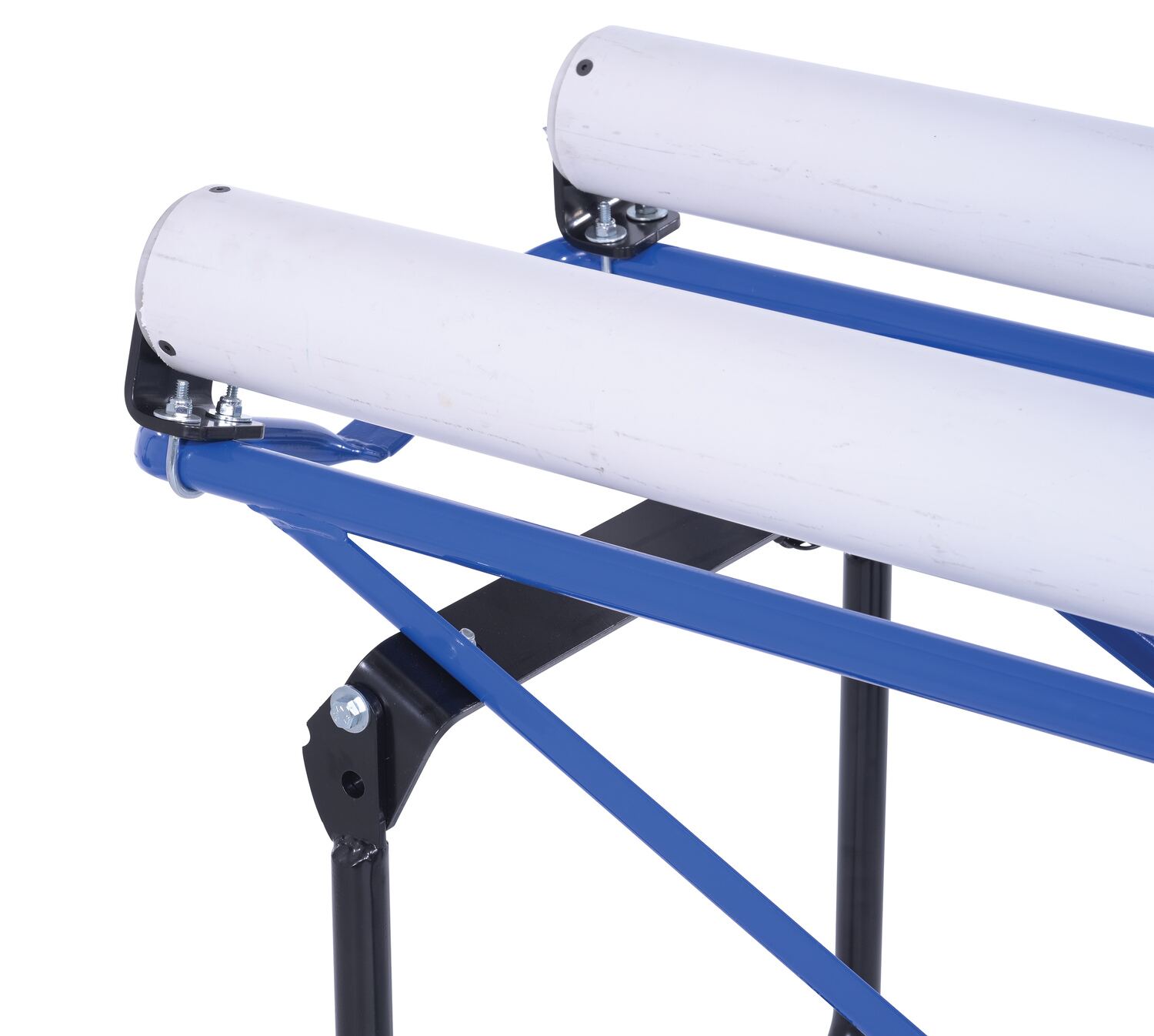 This portable carpet dispenser minimizes lifting and pulling. Slide carpet onto rollers. Carpet unrolls as needed. Retractable legs stabilize the cart. Welded steel construction with powder coat blue finish.