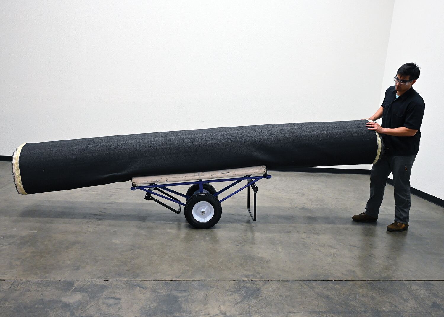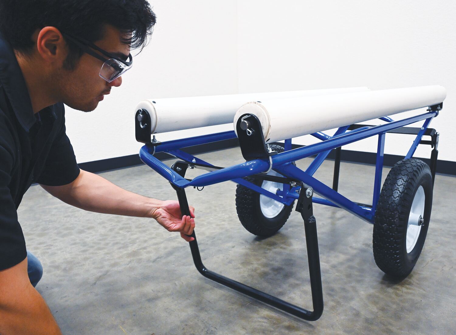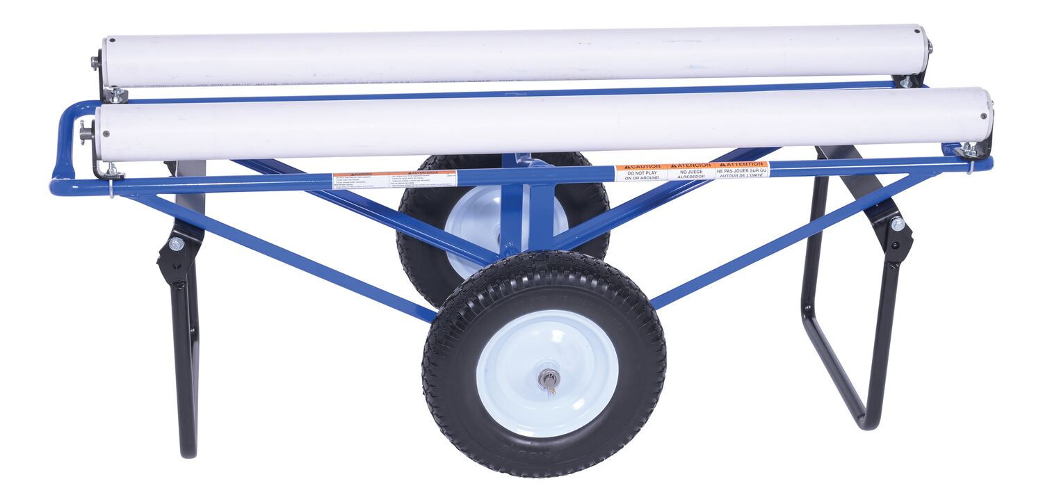 This portable carpet dispenser minimizes lifting and pulling. Slide carpet onto rollers. Carpet unrolls as needed. Retractable legs stabilize the cart. Welded steel construction with powder coat blue finish.