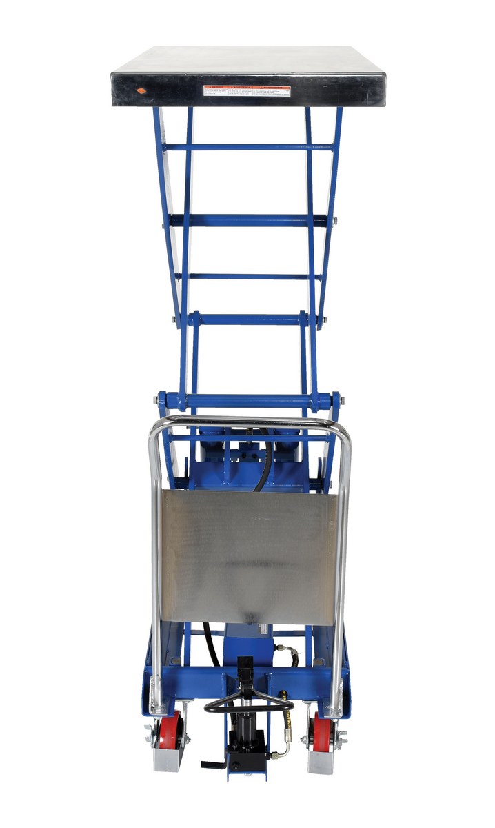 Steel Hydraulic Elevating Cart 47-1/2 In. x 24 In. 1500 Lb. Capacity BlueThe Hydraulic elevating cart minimizes worker bending and lifting through its ergonomic design and portability. Material can be easily loaded onto a cart from a table, lowered to a safe transporting height, and raised to unload at destination. The foot pump includes a soft-lowering down valve. The unit moves easily on four polyurethane casters; two swivel with brakes and two rigid. Features a two-speed foot pump. Features an internal safety velocity fuse in each cylinder.