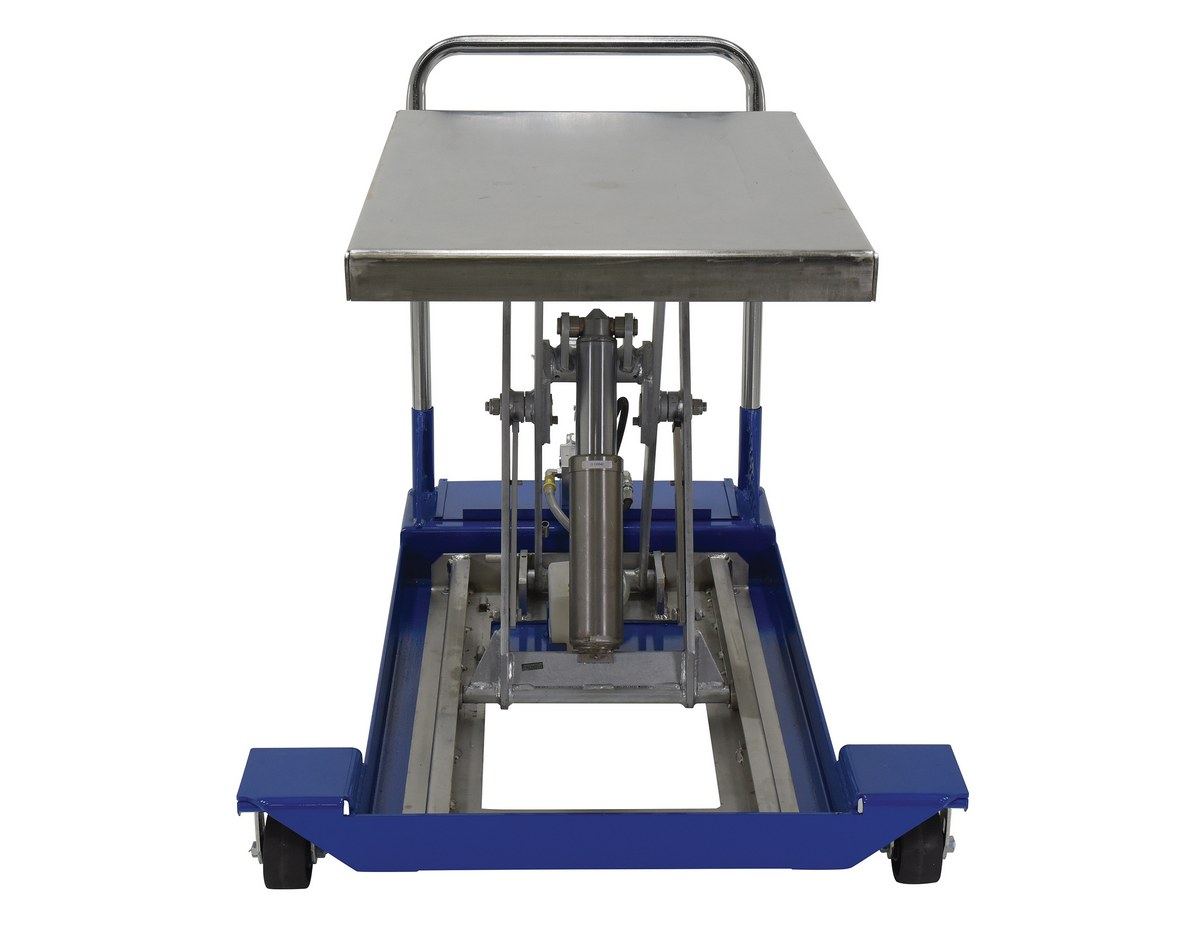 Partially Stainless Steel Foot Pump Scissor Cart 36 In. x 24 In. 1000 Lb. Capacity Blue/SilverThe manually powered Scissor Cart table provides an unparalleled support in lifting, palletizing, loading, and unloading applications. The high handle allows the user to maneuver the cart with ease while minimizing an improper ergonomic position. The cart is raised or lowered with a manual two-speed foot pump. The unit rolls smoothly on two rigid and two swivel casters. While the smooth finish allows the user to place fragile items without the fear of getting scratched, scuffed, or damaged.