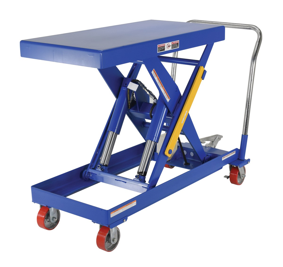 Steel Foot Pump Hydraulic Elevating Cart 20 In. x 40 In. 2500 Lb. Capacity BlueHydraulic elevating carts are well suited for manufacturing and distributing industries. Material can be easily loaded onto a cart from a table, lowered to safe transporting height, and raised to unload at a destination. Foot pump includes a soft-lowering down valve for precise positioning and the perfect ergonomic height. The unit rolls on (4) poly-on-steel casters; two (2) swivel with brakes and two (2) rigid. The tables can be raised and lowered with a single speed foot pump, two speed foot pump or a two speed auto shifter that automatically shifts when the table is loaded. Steel construction with chrome platform and handle on all models, except model cart-200-alum which includes an aluminum platform surface.
