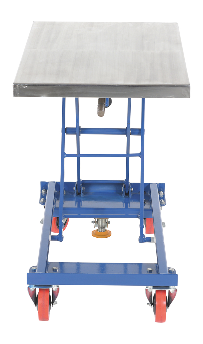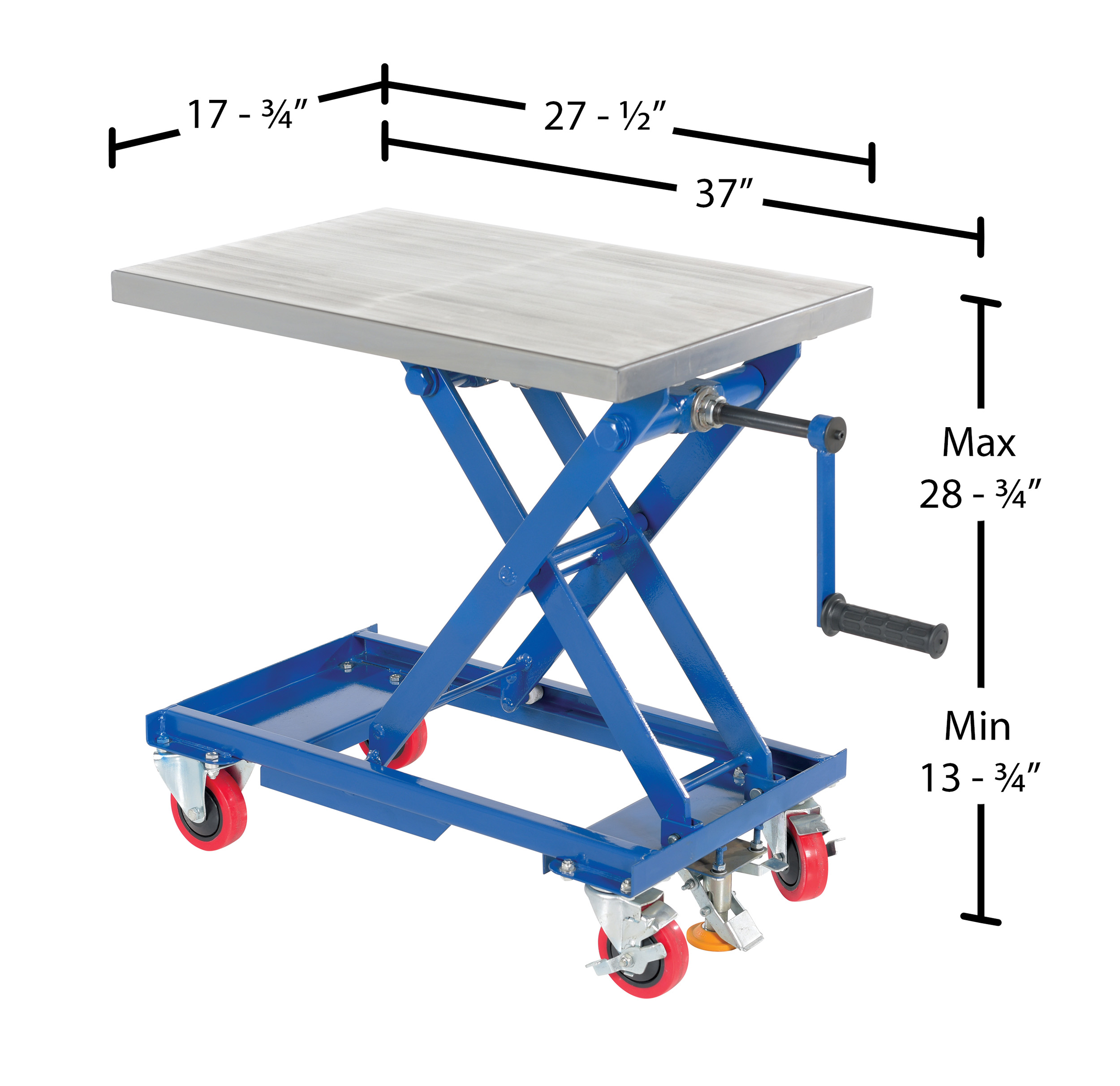 Steel Mechanical Scissor Cart with Hand Crank 18 In. x 28 In. 330 Lb. Capacity Blue/SilverWhen lifting and transporting are both essential, look no further than the mechanical scissor cart. The centrally located hand crank allows the user to raise and lower the platform to a more exact level. A large platform gives the ability to load items in a variety of sizes. Since the platform can be maneuvered to a specific height, the unit can be positioned to best fit the users needs for a more ergonomically friendly experience. Poly casters are included for a smooth roll on a variety of surfaces.