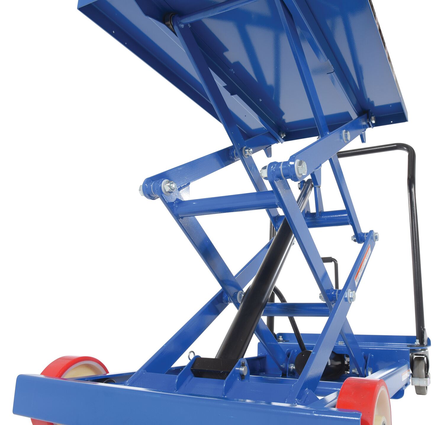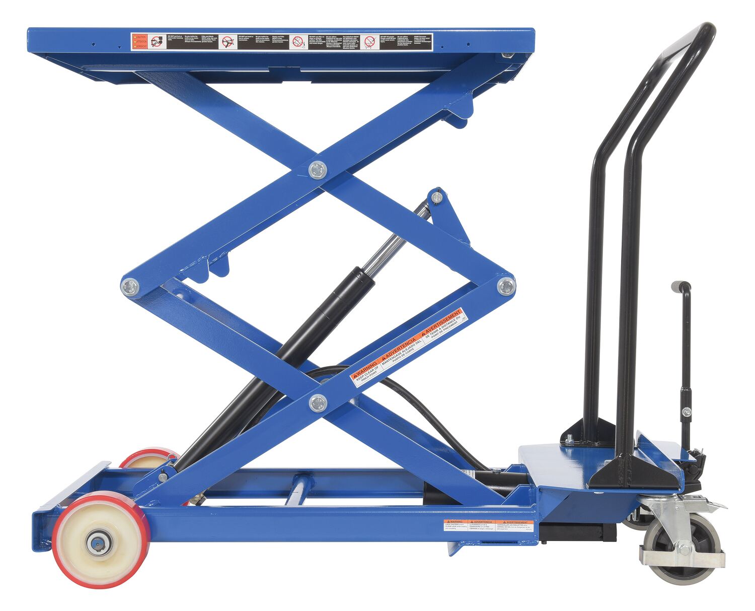 Steel Premium Double Scissor Cart with Foot Release 23-1/4 In. x 33 In. 600 Lb. Capacity BlueThe premium scissor lift cart is constructed of heavy duty steel and designed to withstand the most demanding industrial environments. The simplicity and compactness of these products make them ideal for lifting and transporting loads, order-picking, die handling, and for use in support of assembly operations. There is little exertion required to raise and lower the deck due to the high quality foot-actuated, single speed hydraulic pump. The hydraulic system is equipped with an overload protection valve. Each cart has safety stops to prevent an empty deck from lowering while performing maintenance. A unique tilt-up table top allows for safe and easy maintenance. The two rigid front casters and two rear swivel polyurethane casters with brake provide a high degree of maneuverability; each swivel wheel is protected by guards and is equipped with brakes. Features an internal safety velocity fuse in each cylinder.