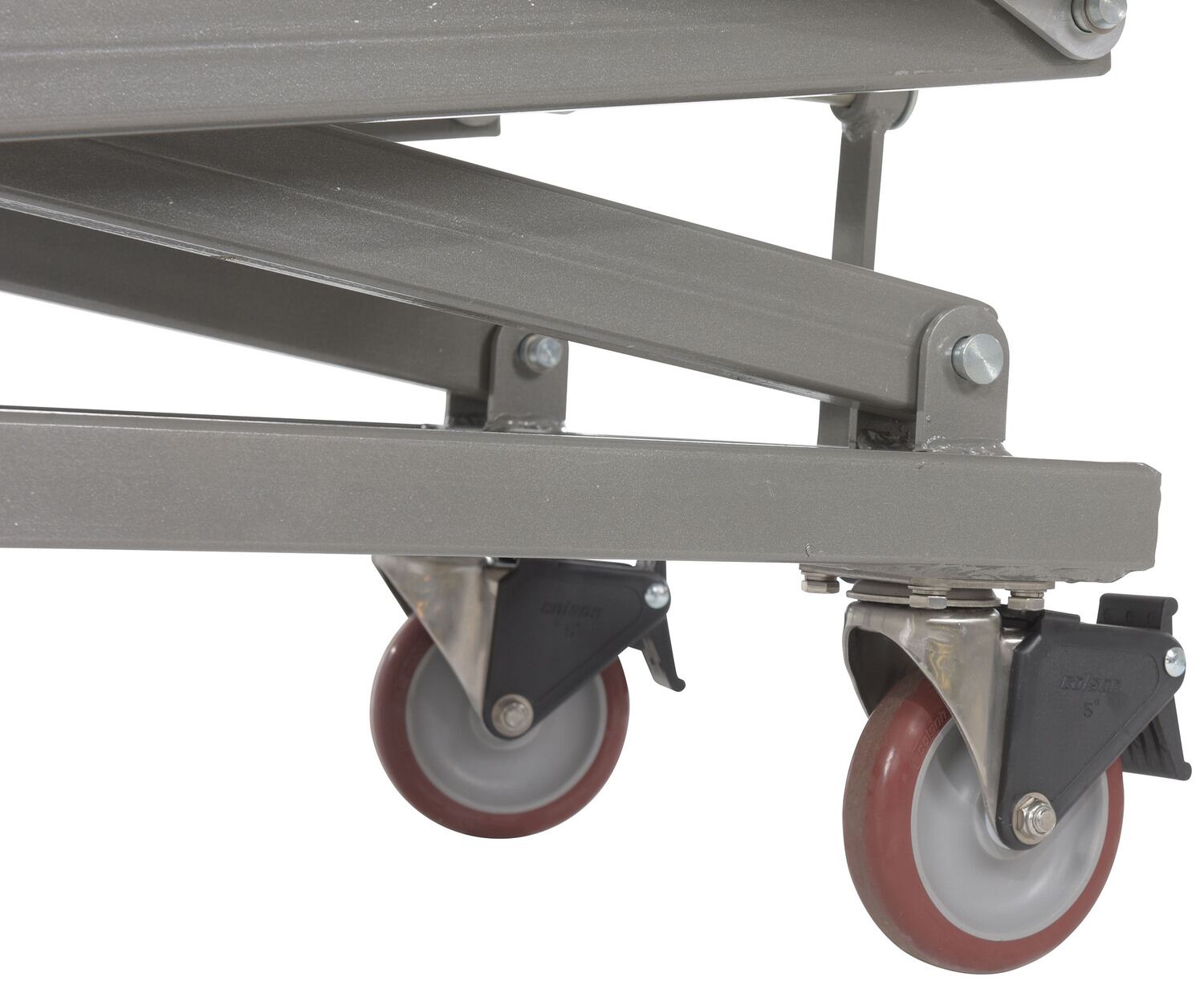 The mechanical Scissor Cart raises and lowers material quickly and easily. The cart rolls smoothly on two rigid and two swivel casters. Mechanical screw drive provides precise positioning with no downward drift. The platform, frame, handle, caster rigs, and hardware are stainless steel. The crank assembly and scissor legs are zinc-plated/painted. The wheels are poly-on-poly. Features an internal safety velocity fuse in each cylinder.
