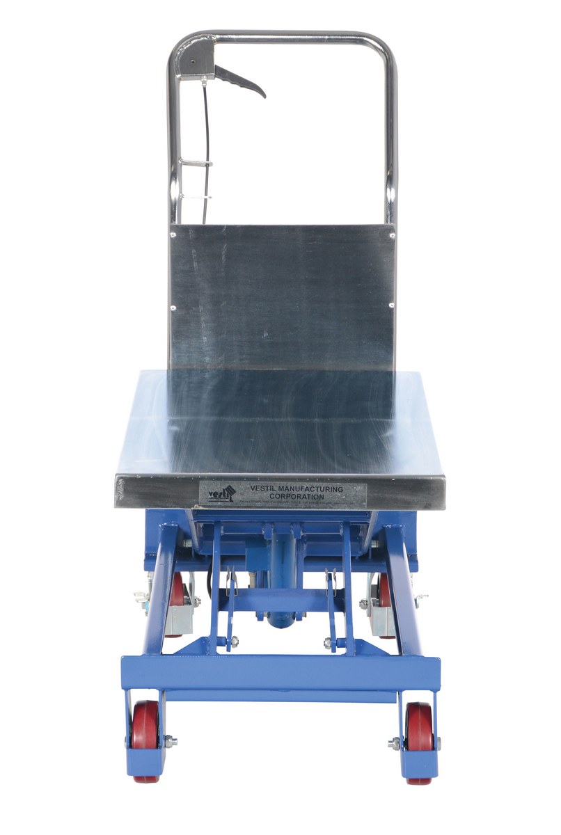 Steel Single Scissor Hydraulic Elevating Cart 32 In. x 18-3/4 In. 750 Lb. Capacity Blue/SilverThe Hydraulic elevating cart minimizes worker bending and lifting through its ergonomic design and portability. Material can be easily loaded onto a cart from a table, lowered to a safe transporting height, and raised to unload at destination. The foot pump includes a soft-lowering down valve. The unit moves easily on four polyurethane casters; two swivel with brakes and two rigid. Features a two-speed foot pump. Features an internal safety velocity fuse in each cylinder.