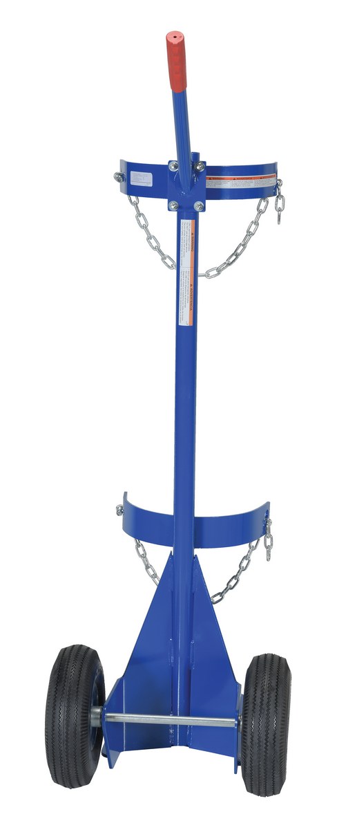 The Cylinder dolly transports cylinders from workstation to workstation. Secure the cylinder with the included restraint chains. Tilt unit back and transport.