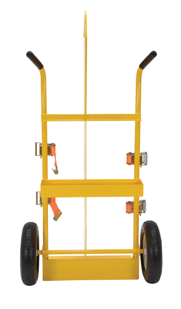 Steel Torch Cart-Lift Eye with Pneumatic Wheels 23 In. x 34-1/2 In. x 66-3/8 In. 500 Lb. Capacity YellowThe welding Cylinder torch cart is designed for transporting cylinders and cutting torch. Includes two (2) tank compartments with heavy-duty ratchet straps. Convenient open-top storage tray. Brackets are included for holding cutting torch and hose. Sturdy handles and large wheels for tilt-n-go portability. Welded steel construction with powder coat finish. Not designed for use as a storage means for gas cylinders.