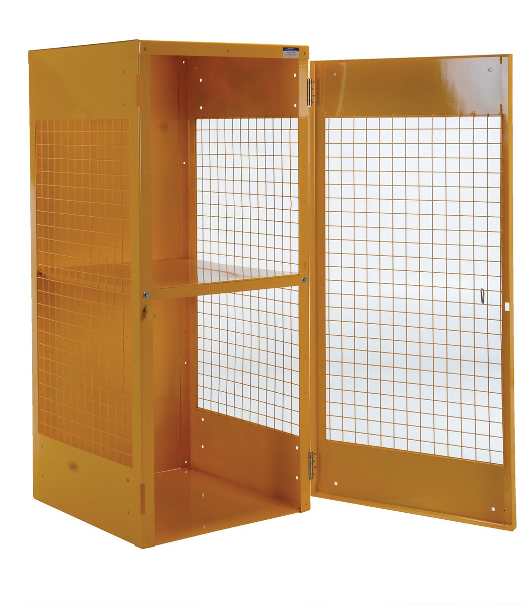 Durable steel cabinet for storage of LP style cylinders. Cylinder storage capacity is based on cylinder size. Sides and door are made of expanded steel mesh. Bottom, back and top are made of solid sheet steel. Lockable doors protect cylinders (padlock not included). Base includes lag holes for securing unit to floor (hardware is not included). Rugged welded steel construction with safety yellow finish. Cabinet ships fully assembled.