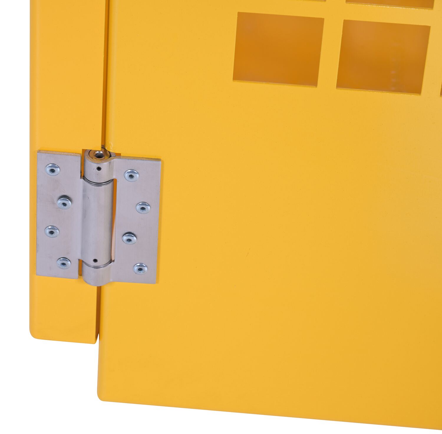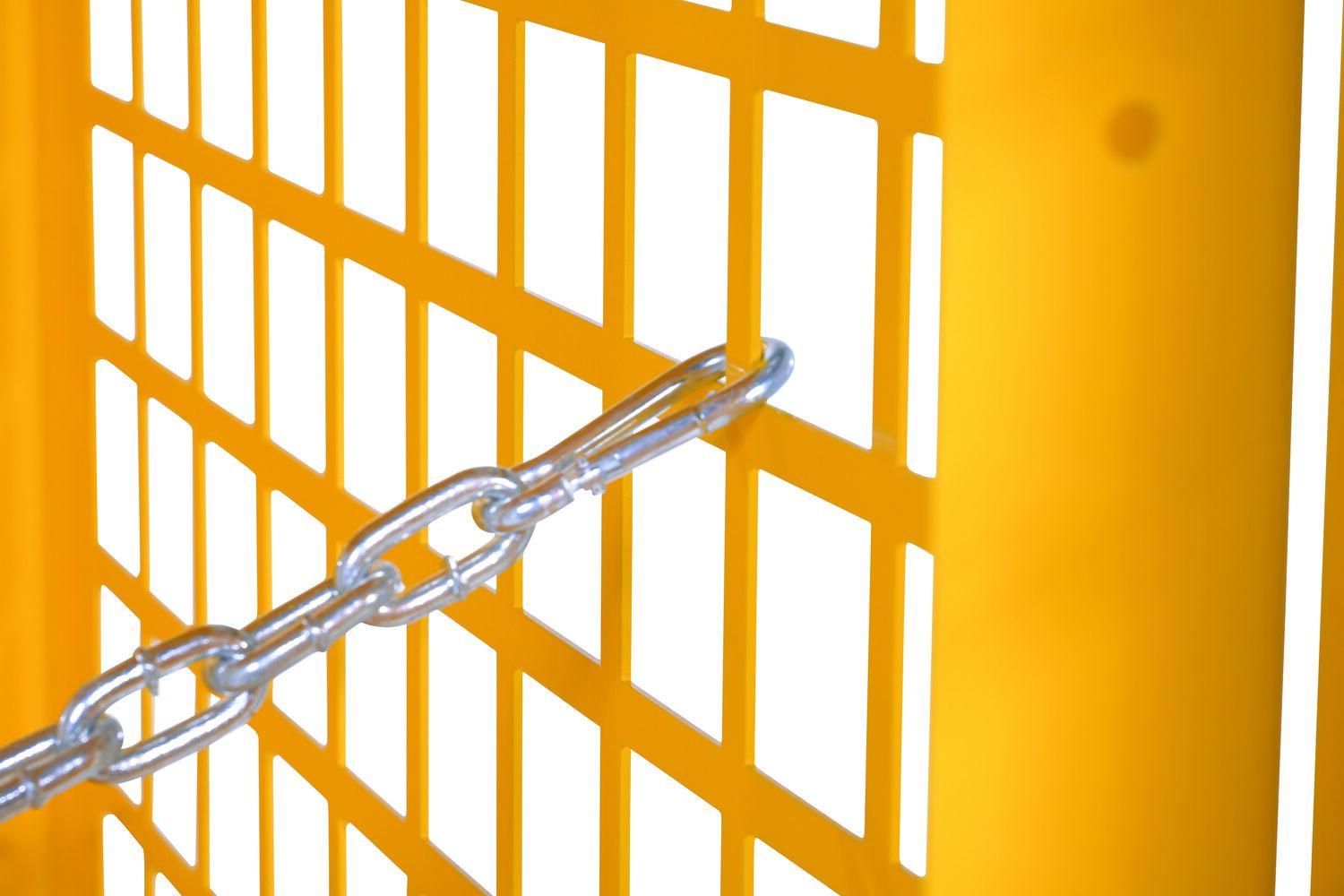 Steel cabinet for storage of cylinders. Cylinder storage capacity is based on cylinder size. Sides and door are made of expanded steel mesh. Bottom, back and top is made of solid sheet steel. Lockable doors protect cylinders (padlock not included). Base includes lag holes for securing cylinders. Include chains for securing cylinders. Rugged steel construction with safety yellow finish. Powder coat finish.
