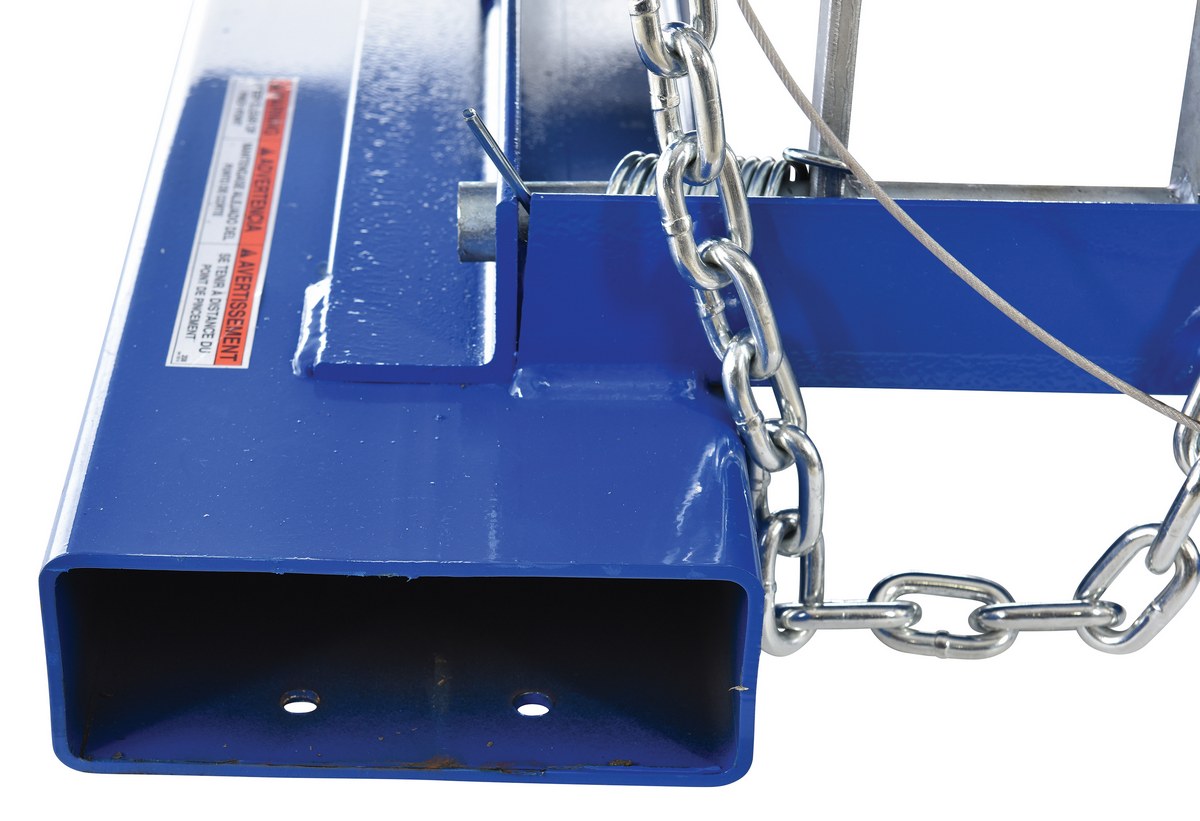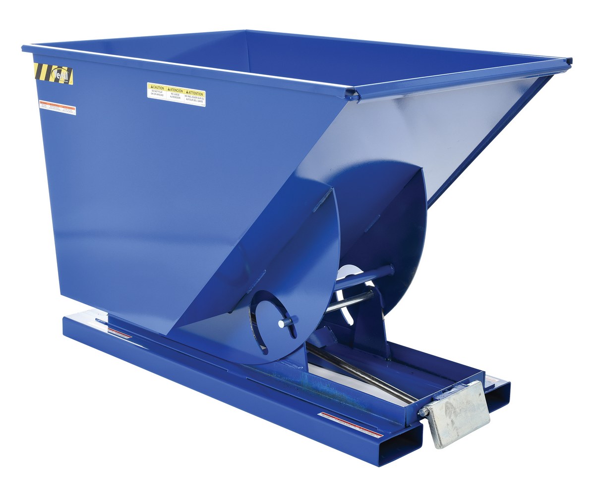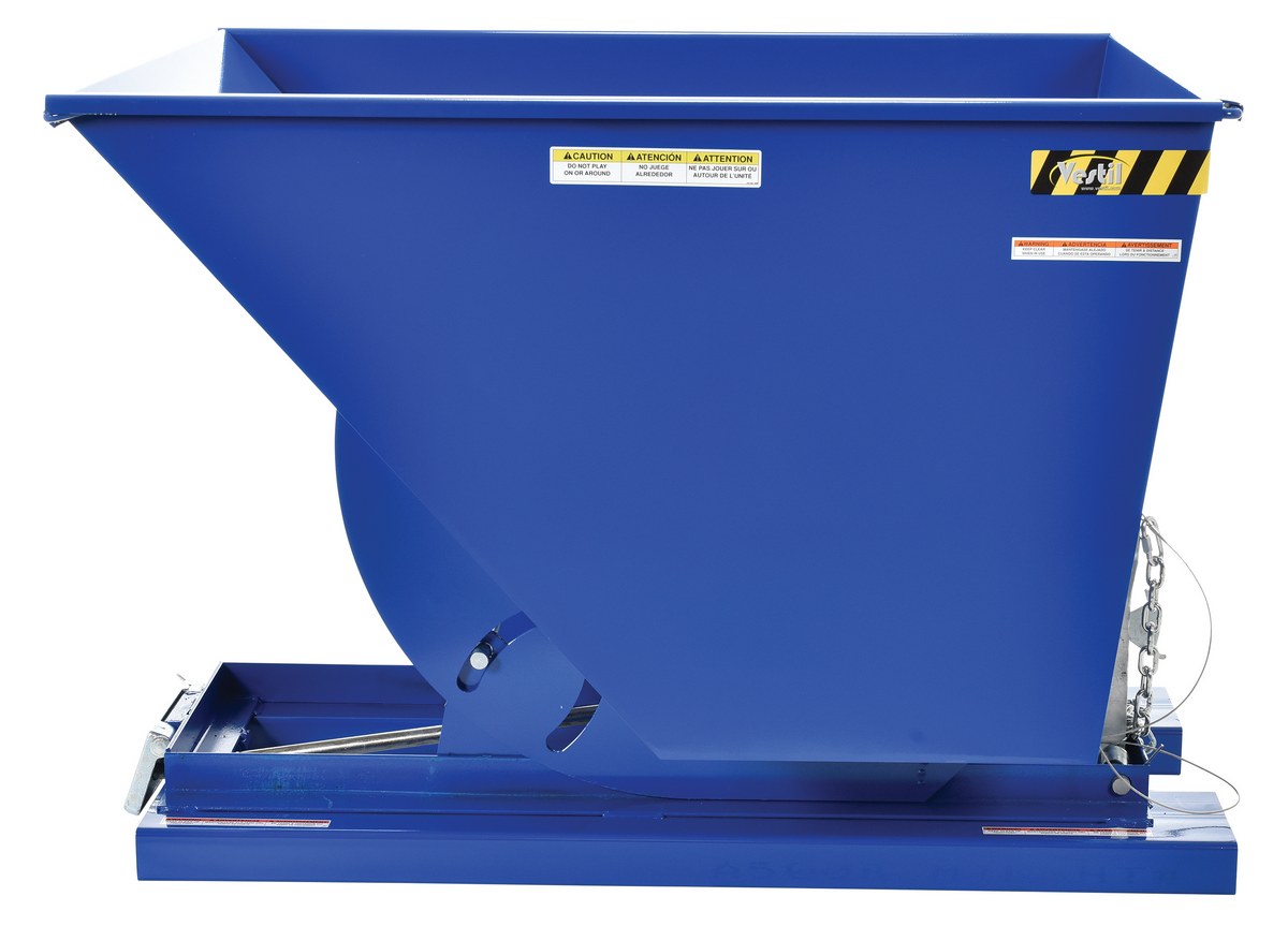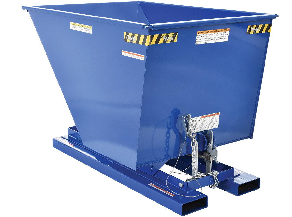 Steel Heavy Duty Self Dumping Hopper 1 Cubic Yard 6000 Lb. Capacity BlueThis Heavy Duty self-dumping steel Hopper with bumper release automatically dumps when bumper release contacts the front of the dumpster. Hopper returns to an upright and locked position automatically after it dumps. Also includes a cable that may be operated from the seat of the fork truck to manually dump the hopper. The included safety restraint should be properly secured to a fork truck before dumping. (Length dimension is measured at top of chute.) Hopper is stackable if you stack the top hopper turned ninety (90) degrees from the bottom. Self-dumping hoppers facilitate compliance with OSHA general industry rule 29 CFR 1910.178(m)(5)(iii) by allowing lift truck operators to remain at the controls of their truck throughout the dumping process.