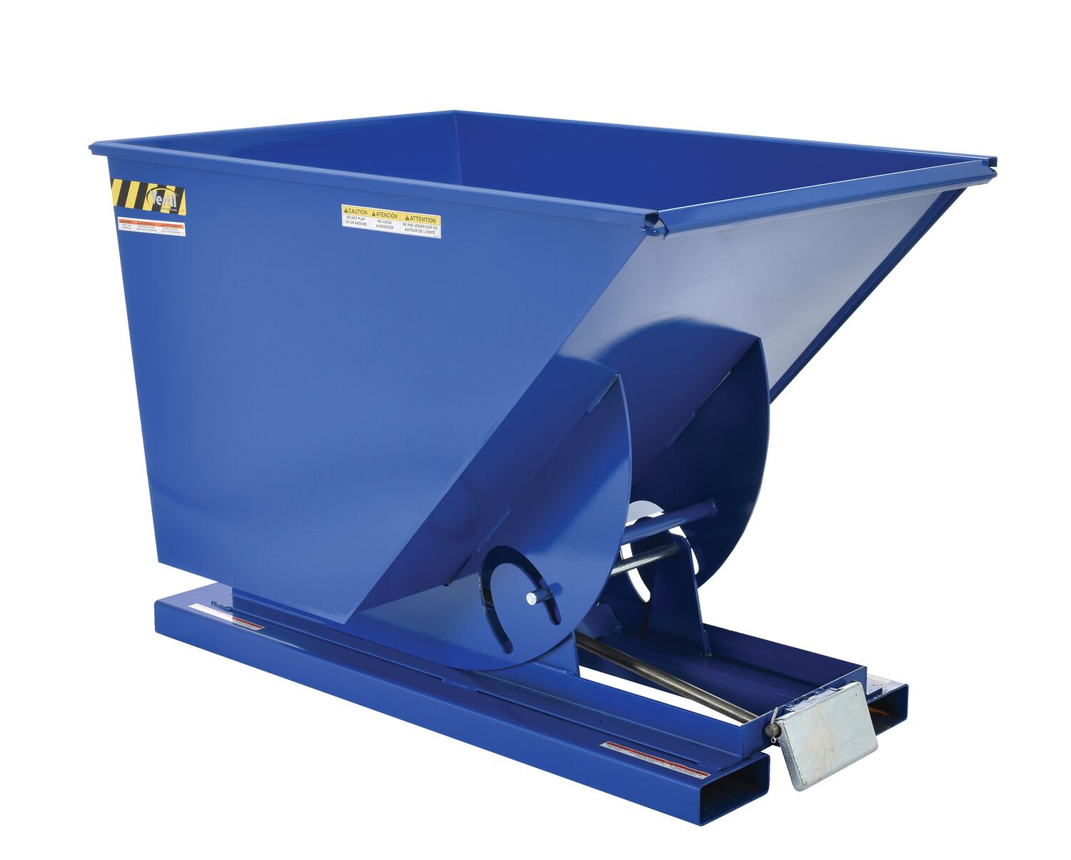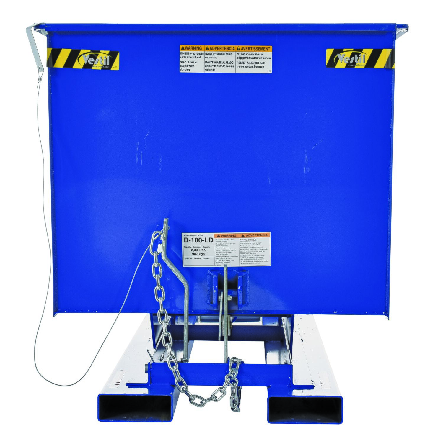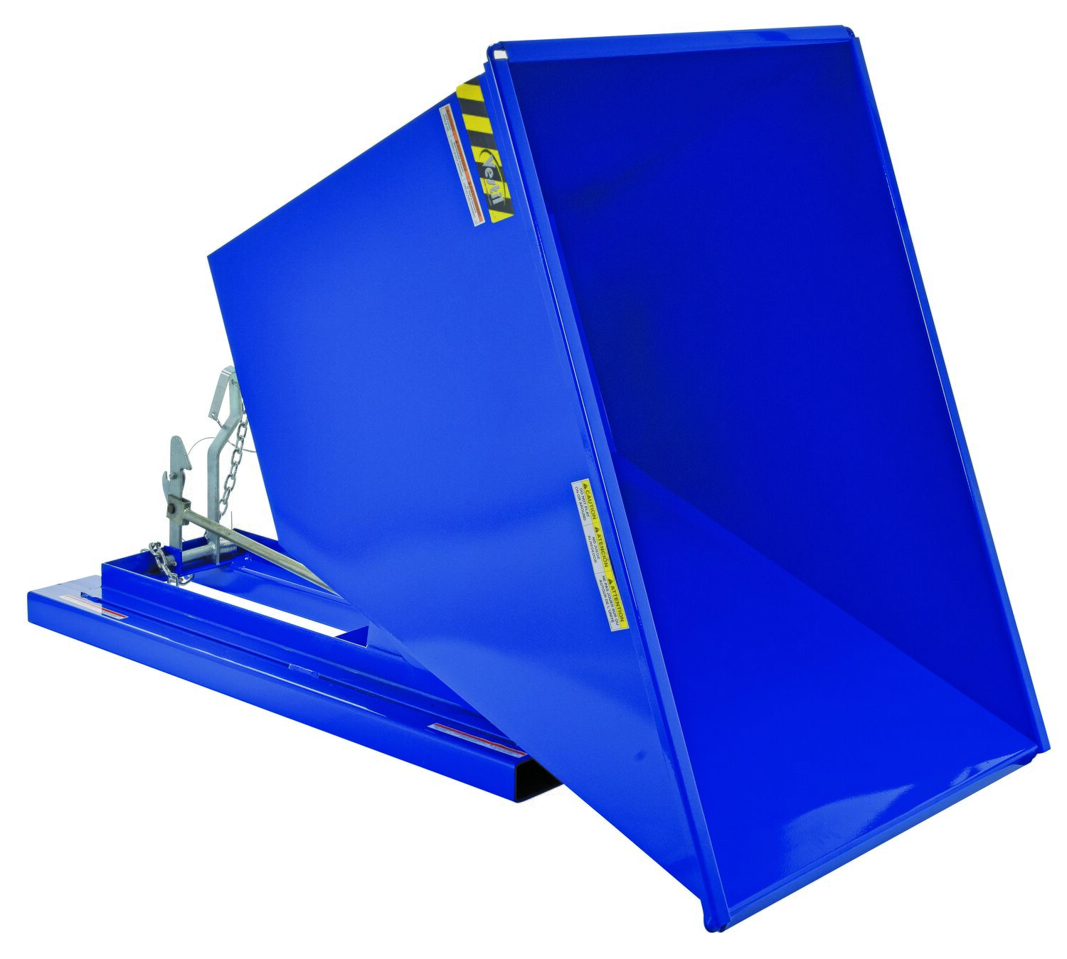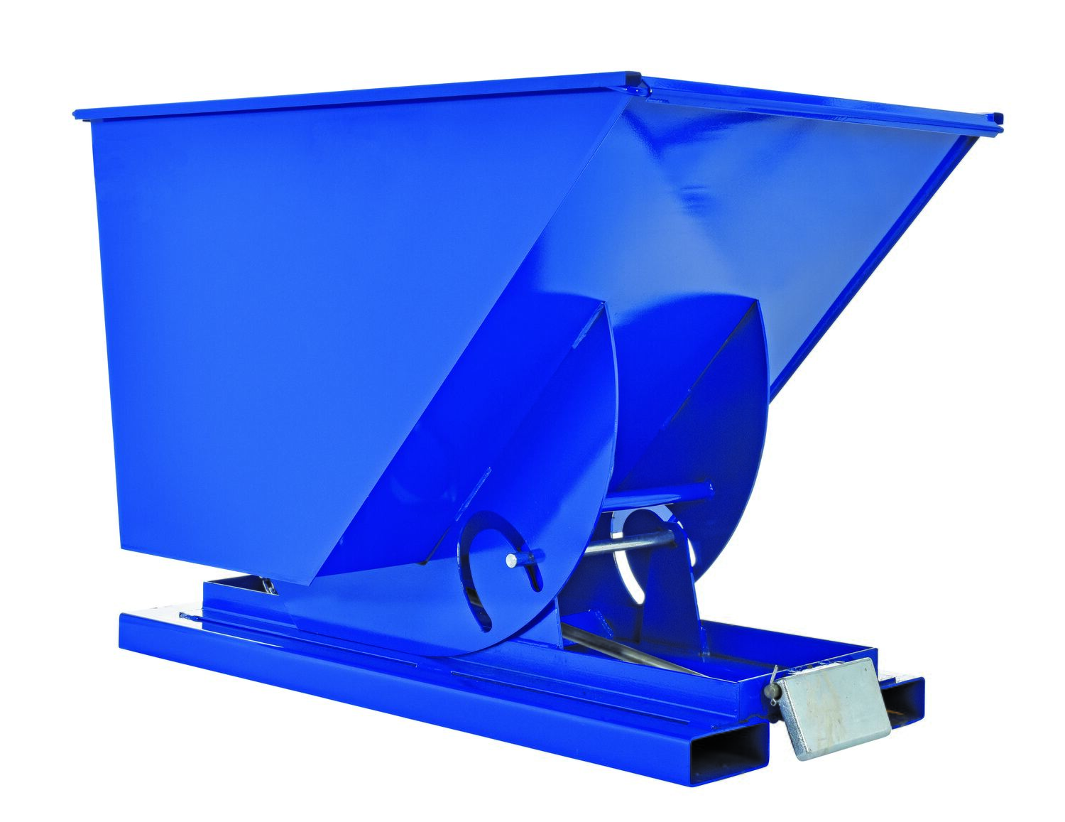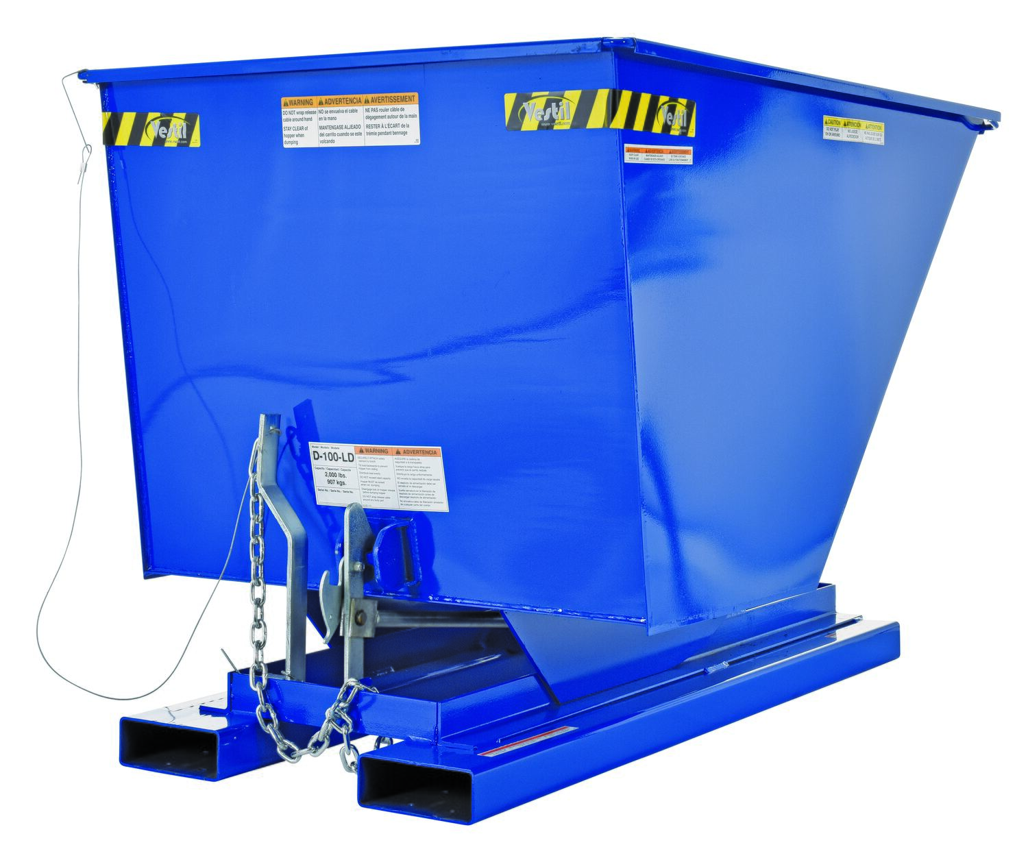 Steel Light Duty Self Dumping Hopper 1 Cubic Yard 2000 Lb. Capacity BlueThis Light Duty self-dumping steel Hopper with bumper release automatically dumps when bumper release contacts the front of the dumpster. Hopper returns to an upright and locked position automatically after it dumps. Also includes a cable that may be operated from the seat of the fork truck to manually dump the hopper. The included safety restraint should be properly secured to a fork truck before dumping. (Length dimension is measured at top of chute.) Hopper is stackable if you stack the top hopper turned ninety (90) degrees from the bottom. Self-dumping hoppers facilitate compliance with OSHA general industry rule 29 CFR 1910.178(m)(5)(iii) by allowing lift truck operators to remain at the controls of their truck throughout the dumping process.