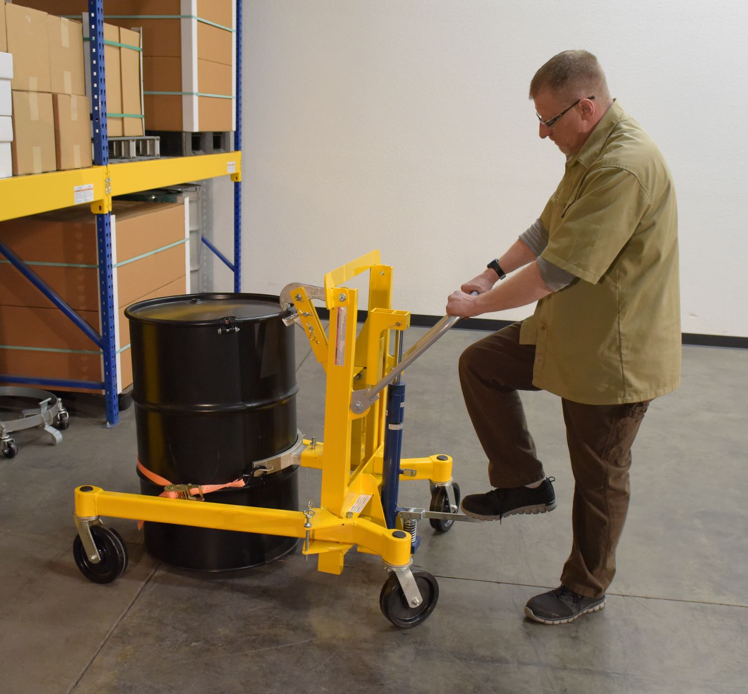 A hydraulic kit can change your drum cart into a more ergonomically friendly machine. It allows the unit to be lowered and raised in a quicker fashion. Strong construction lets the user move loads, both heavy and light.