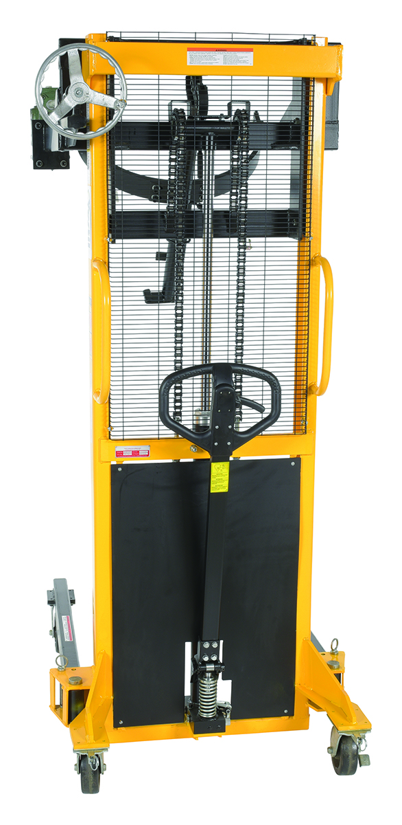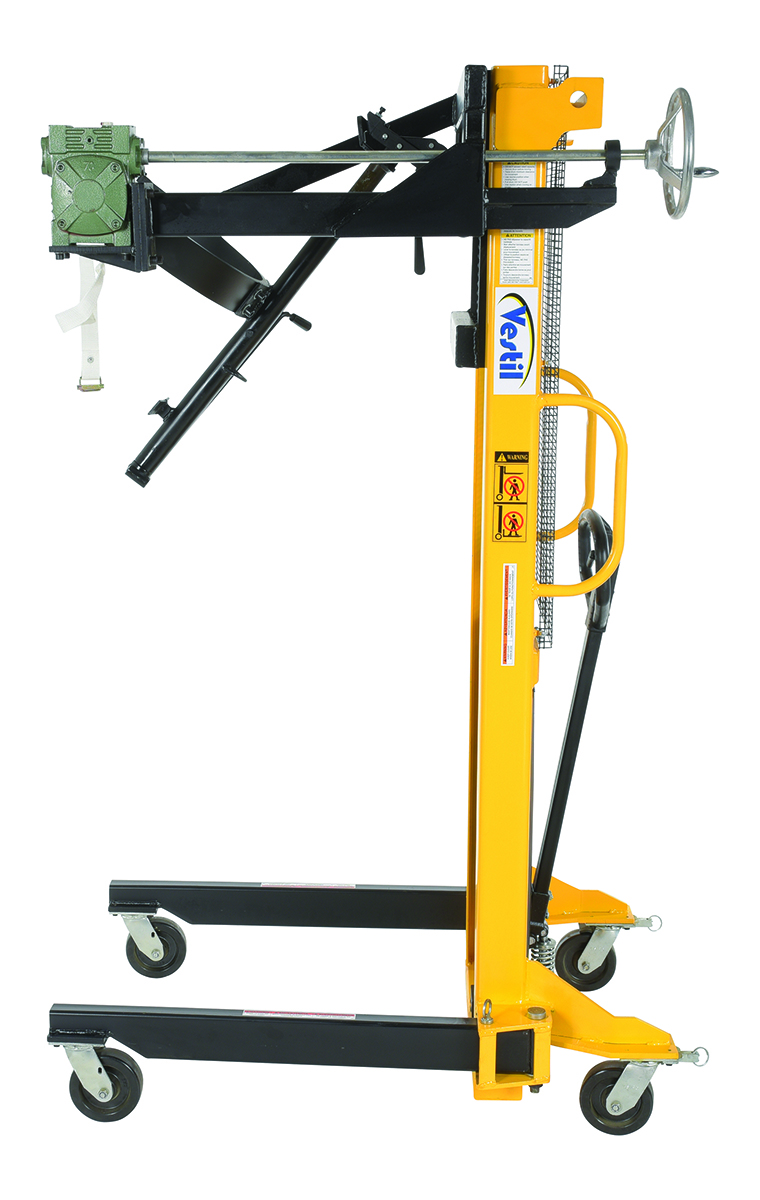 Steel Manual Drum Lifter/Rotator/Transport 51-1/2 In. x 34 In. x 82-5/8 In. 550 Lb. Capacity Yellow/BlackThe manual operation, portable Drum Lifter/rotator/transporter features pivoting straddle legs for access to drums on pallets. Legs will manually pivot and lock into place with locking pin.