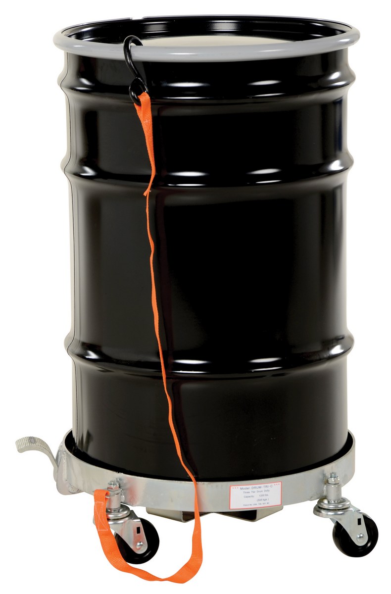 Steel Tilting Drum Dolly Three Tier 21-1/2 In. x 21-1/2 In. x 5-7/8 In. 1200 Lb. Capacity SilverTilting drum dolly tilts for better liquid extraction. Fits onto a variety of round steel drums tilting feature is foot-operated and locks into place when activated. This feature only works with the outside/biggest drum that the unit will accommodate. Patent pending.