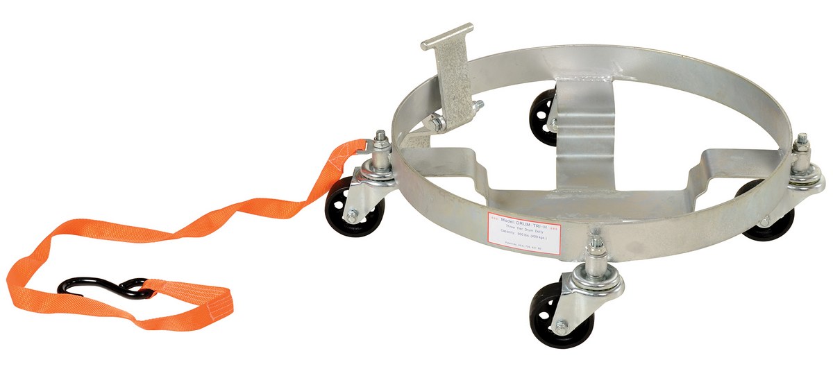Steel Tilting Drum Dolly Three Tier 21-1/2 In. x 21-1/2 In. x 5-7/8 In. 900 Lb. Capacity SilverTilting drum dolly tilts for better liquid extraction. Fits onto a variety of round steel drums tilting feature is foot-operated and locks into place when activated. This feature only works with the outside/biggest drum that the unit will accommodate. Patent pending.