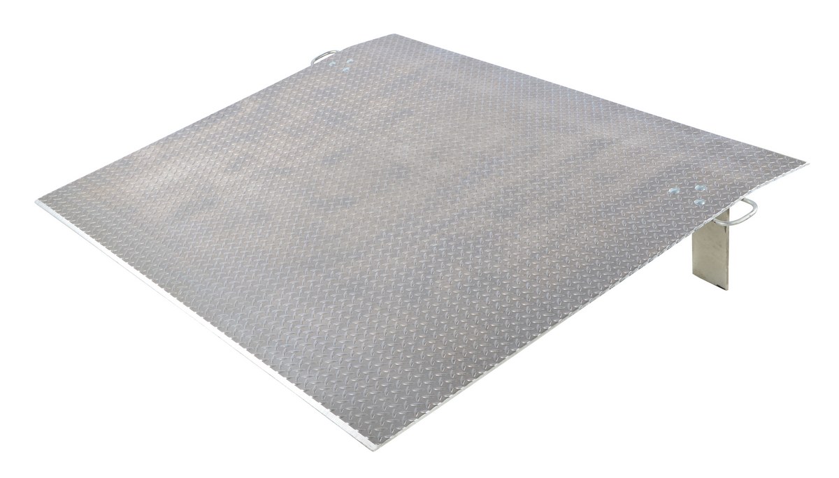 Aluminum Economizer Dock Plate Usable 72 In. x 60 In. 3/8 In. Plate Thickness 2500 Lb. CapacityThe aluminum economizer dock plate is an economical way to speed up truck loading and unloading. The unit spans the opening between dock and trailer to allow pallet or hand trucks along with traffic to safely move in and out of the trailer. The dock plate is constructed of high strength, non-skid aluminum alloy tread plate. The lightweight design with bolt on zinc plated legs and handles on each side makes portability easy. Locking legs for OSHA compliance. Not for use with fork trucks.