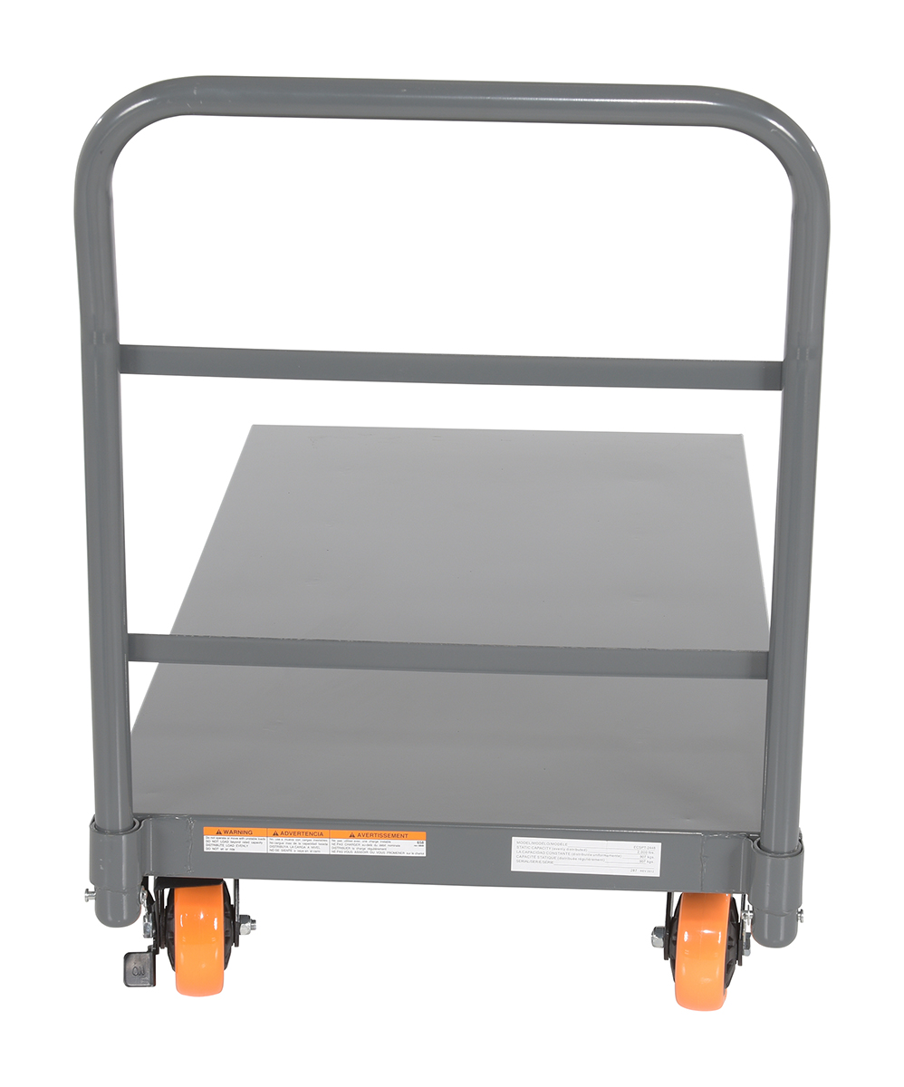 This steel platform truck with a solid, smooth steel deck is all welded and features structural reinforcement underneath for extra strength. It includes one (1) removable high-polished steel handle and rolls smoothly casters. Comes standard with a floor lock.