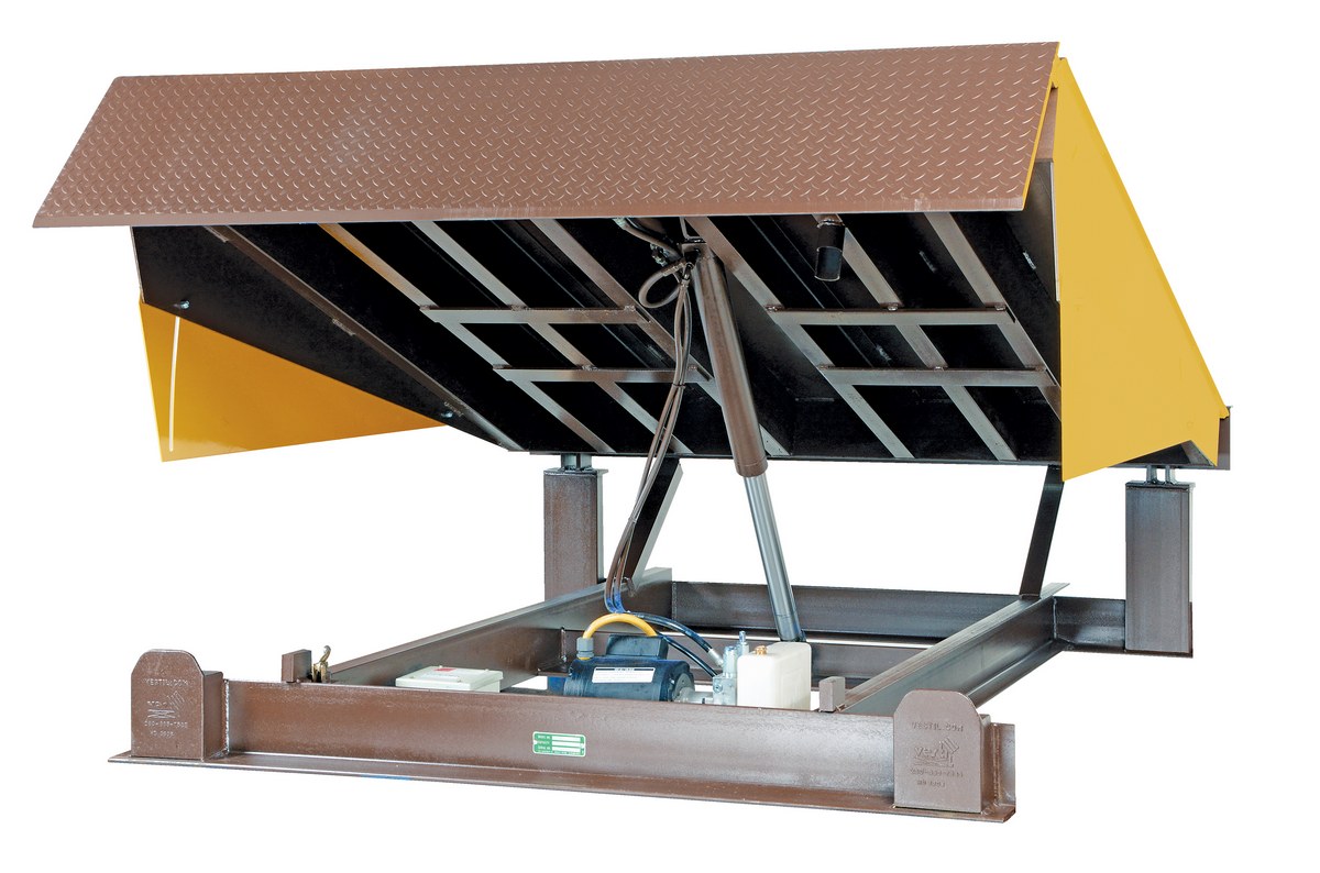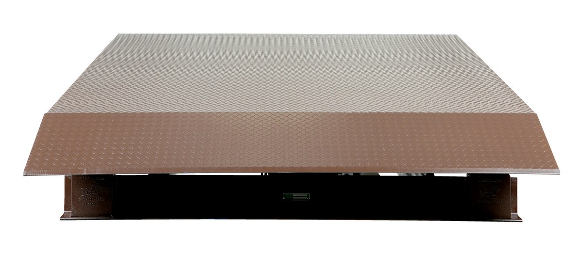 Steel Electric Hydraulic Dock Leveler 74"W x 86"L x 24"D Pit Dimensions, 25000 Lb. Capacity Brown/YellowThe electric hydraulic dock leveler is ideal for high usage dock areas. The hydraulic design is state of the art and consists of a single button operation. The operator pushes and holds the "raise" button which activates the hydraulic pump and raises the deck. When the deck reaches the raised position the lip automatically extends. The operator releases the "raise" button and the deck descends to rest on the trailer. The control box includes a red emergency stop button standard. When the truck pulls away, the deck descends to full down position, trips the limit switch and returns automatically to the level cross traffic position. It includes telescopic steel toe guards on both sides, flush with platform edge and includes two (2) laminated bumpers.