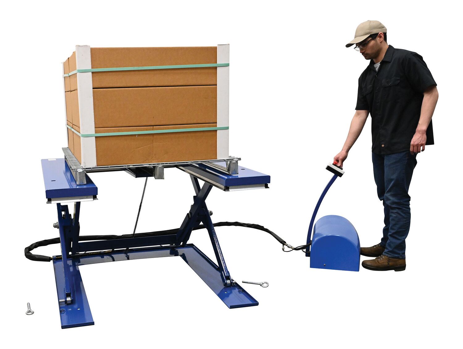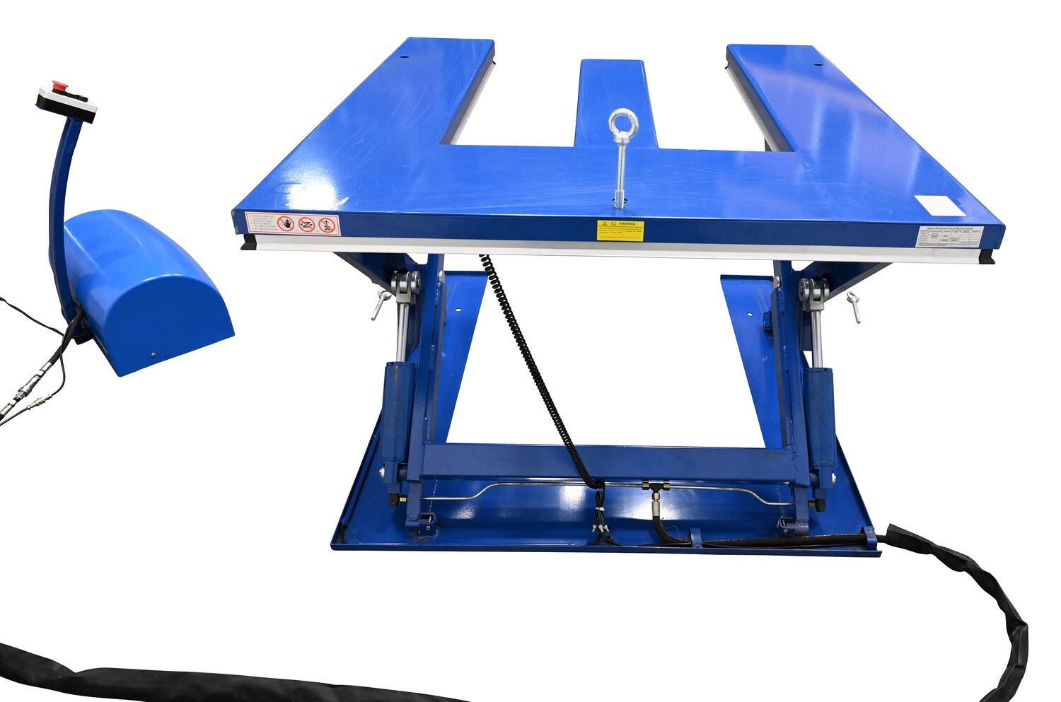 Steel Low Profile Electric Lift Table E Type 56 In. x 52-3/4 In. x 3-1/2 In. 2000 Lb. Capacity BlueThe low profile electric lift tables are ideal for manufacturing and distribution facilities. The unique, steel constructed "E" design provides a center support beam to prevent the lifted product from deflecting downward in the center. Numerous protective features include electric toe guards, velocity cylinders, and emergency stop buttons, providing personnel with the utmost safety. An external power pack is equipped with a pressure relief valve which prevents overloading while controlling lowering speed. To raise and lower the unit, simply utilize the "up and down" push button design on the 24V control box for precise ergonomic positioning of product.