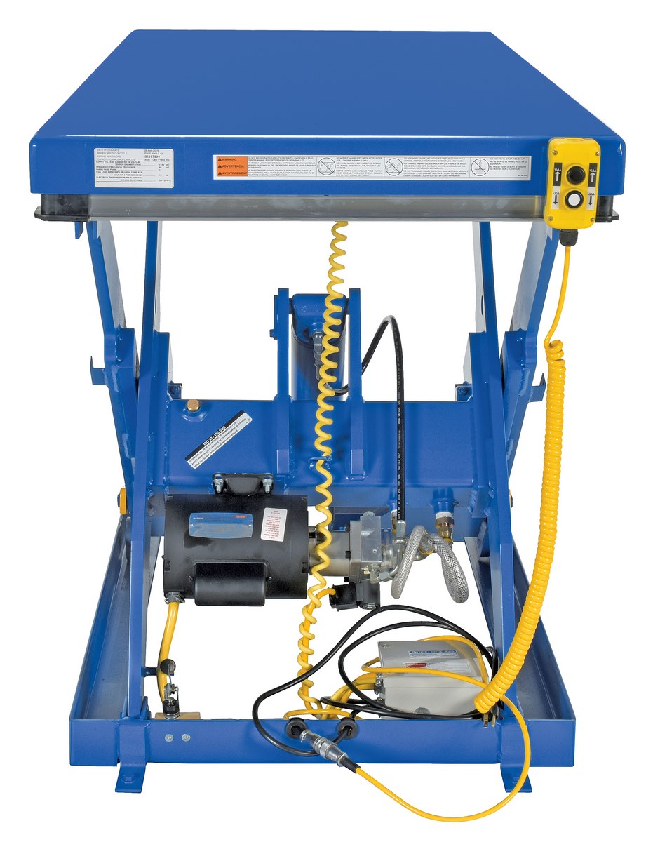 Steel Electric Hydraulic Lift Table 30 In. x 60 In. 3000 Lb. Capacity BlueThe electric hydraulic scissor lift table is used by all types of manufacturing and warehouse facilities. Safety features include a patented pinch point perimeter toe guard to protect pinch points while lowering the table, fused push button control, internal safety velocity fuse to maintain platform height in the event of hose or fitting failure, integral maintenance prop, adjustable upper travel limit switch to stop the table at maximum height, and displacement-style hydraulic cylinders for maximum strength. It also features a pressure plated pump, manifold system, and state-of-the-art lifetime lubricated bearings. The standard 56 frame electric motor is fully enclosed with additional voltage options available. Contact factory if platform dimensions are crucial.