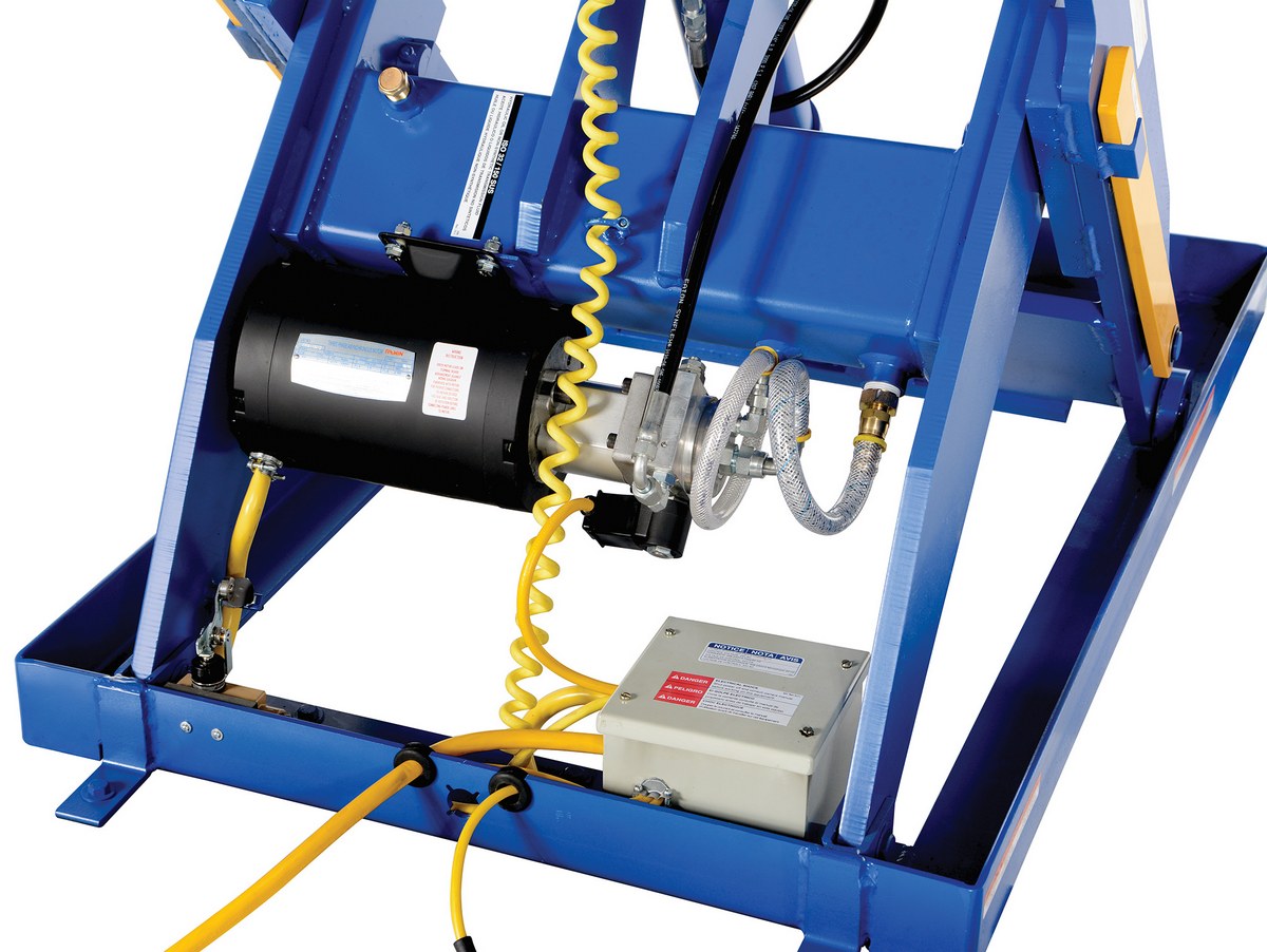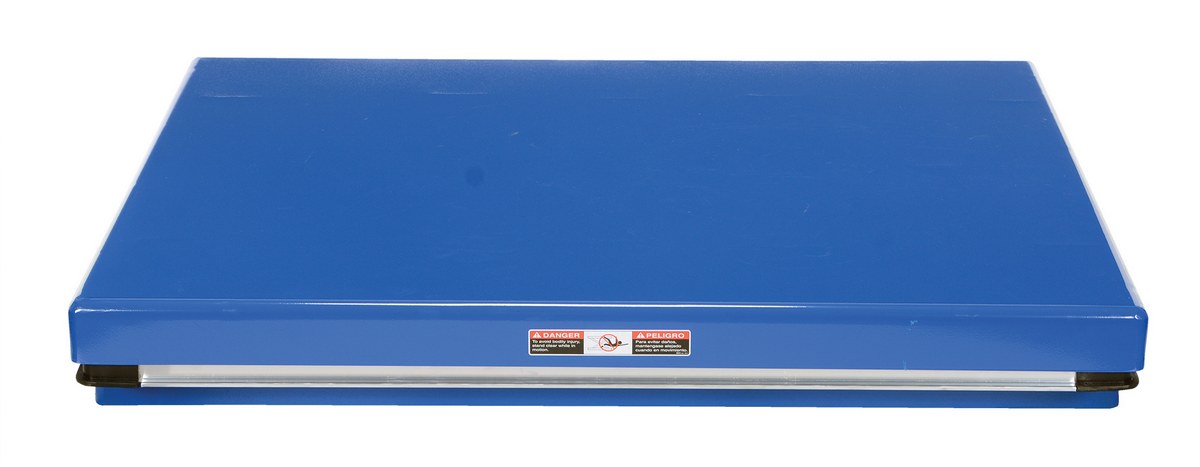 Steel Electric Hydraulic Lift Table 40 In. x 48 In. 3000 Lb. Capacity BlueThe electric hydraulic scissor lift table is used by all types of manufacturing and warehouse facilities. Safety features include a patented pinch point perimeter toe guard to protect pinch points while lowering the table, fused push button control, internal safety velocity fuse to maintain platform height in the event of hose or fitting failure, integral maintenance prop, adjustable upper travel limit switch to stop the table at maximum height, and displacement-style hydraulic cylinders for maximum strength. It also features a pressure plated pump, manifold system, and state-of-the-art lifetime lubricated bearings. The standard 56 frame electric motor is fully enclosed with additional voltage options available. Contact factory if platform dimensions are crucial.