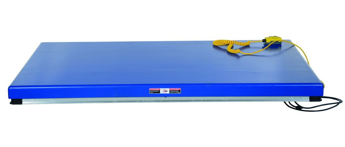 Steel Electric Hydraulic Lift Table 48 In. x 72 In. 3000 Lb. Capacity BlueThe electric hydraulic scissor lift table is used by all types of manufacturing and warehouse facilities. Safety features include a patented pinch point perimeter toe guard to protect pinch points while lowering the table, fused push button control, internal safety velocity fuse to maintain platform height in the event of hose or fitting failure, integral maintenance prop, adjustable upper travel limit switch to stop the table at maximum height, and displacement-style hydraulic cylinders for maximum strength. It also features a pressure plated pump, manifold system, and state-of-the-art lifetime lubricated bearings. The standard 56 frame electric motor is fully enclosed with additional voltage options available. Contact factory if platform dimensions are crucial.