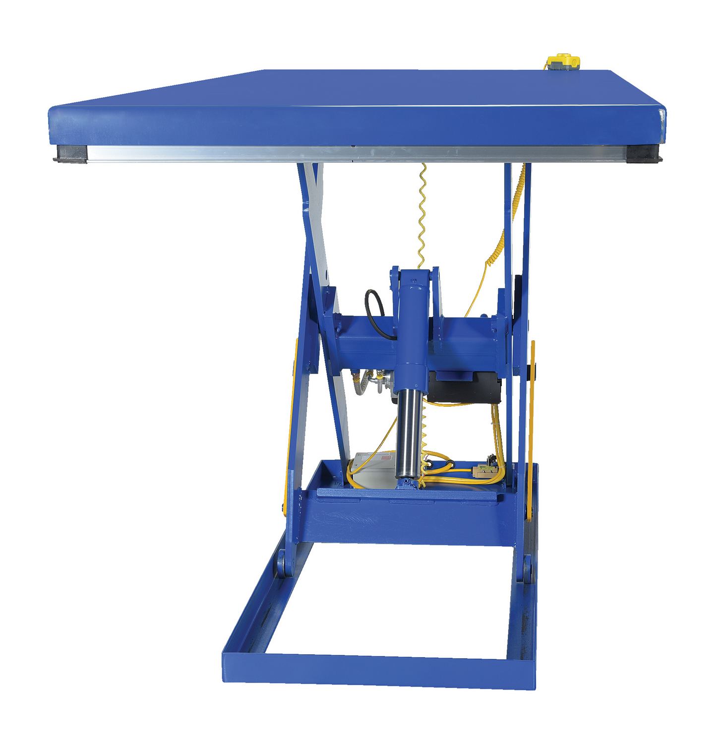 Steel Electric Hydraulic Lift Table 48 In. x 96 In. 2000 Lb. Capacity BlueThe electric hydraulic scissor lift table is used by all types of manufacturing and warehouse facilities. Safety features include a patented pinch point perimeter toe guard to protect pinch points while lowering the table, fused push button control, internal safety velocity fuse to maintain platform height in the event of hose or fitting failure, integral maintenance prop, adjustable upper travel limit switch to stop the table at maximum height, and displacement-style hydraulic cylinders for maximum strength. It also features a pressure plated pump, manifold system, and state-of-the-art lifetime lubricated bearings. The standard 56 frame electric motor is fully enclosed with additional voltage options available. Contact factory if platform dimensions are crucial.