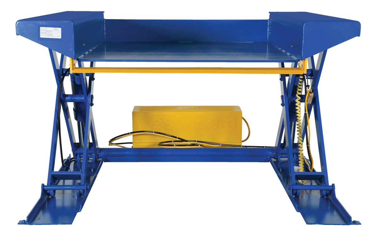 Steel Ground Lift Scissor Table 44 In. x 50 In. 4000 Lb. Capacity BlueThe ground lift scissor table is designed for use when fork trucks are not available. The pallets can be loaded onto the platform with pallet trucks and raised to an ergonomic working height. Safety features include an entry-side electric toe guard to protect pinch points during lowering of the table, velocity fuse to maintain platform height in the event of a hose or fitting failure, foot control, maintenance prop, and upper travel limit switch to stop the table at maximum height reducing motor wear. The motor is totally enclosed standard with additional voltage options available. The remote power unit can be located up to eight (8) feet away from the table. Optional accordion skirting is available.