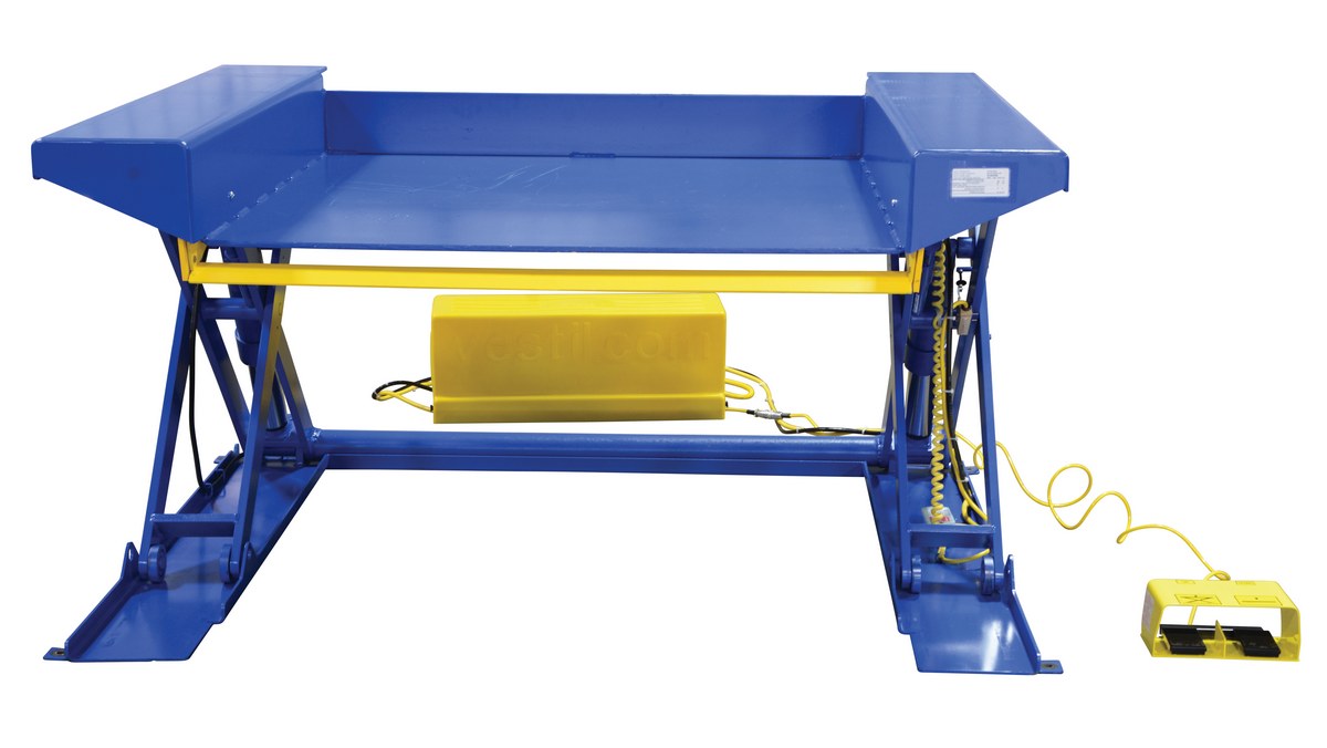 Steel Ground Lift Scissor Table 52 In. x 50 In. 4000 Lb. Capacity BlueThe ground lift scissor table is designed for use when fork trucks are not available. The pallets can be loaded onto the platform with pallet trucks and raised to an ergonomic working height. Safety features include an entry-side electric toe guard to protect pinch points during lowering of the table, velocity fuse to maintain platform height in the event of a hose or fitting failure, foot control, maintenance prop, and upper travel limit switch to stop the table at maximum height and reduce motor wear. The motor is totally enclosed standard with additional voltage options available. The remote power unit can be located up to eight (8) feet away from the table. Optional accordion skirting is available.