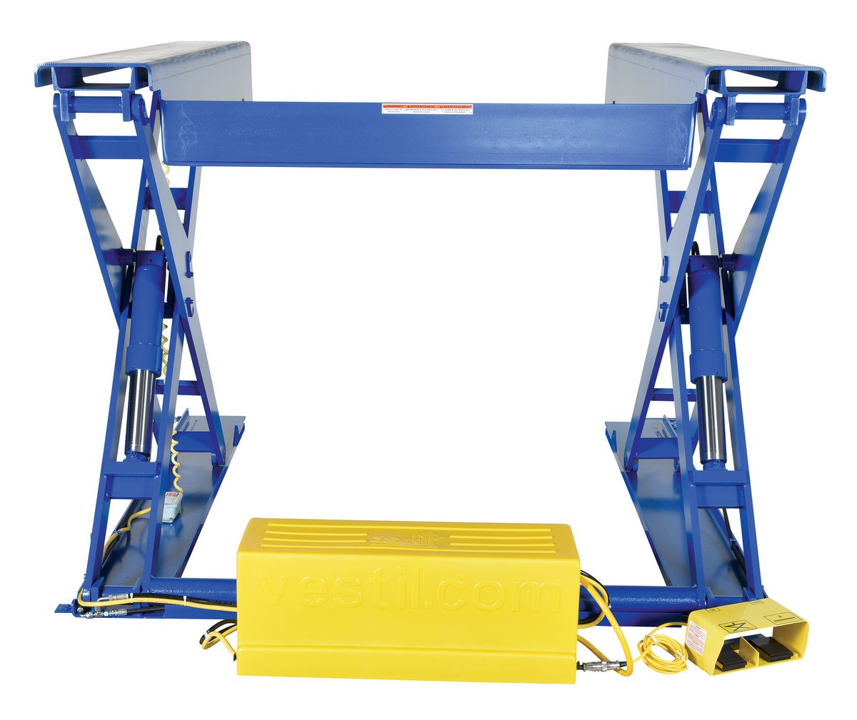 Steel Ground Lift Scissor Table 52 In. x 70 In. 4000 Lb. Capacity BlueThe ground lift scissor table is designed for use when fork trucks are not available. The pallets can be loaded onto the platform with pallet trucks and raised to an ergonomic working height. Safety features include an entry-side electric toe guard to protect pinch points during lowering of the table, velocity fuse to maintain platform height in the event of a hose or fitting failure, foot control, maintenance prop, and upper travel limit switch to stop the table at maximum height and reduce motor wear. The motor is totally enclosed standard with additional voltage options available. The remote power unit can be located up to eight (8) feet away from the table. Optional accordion skirting is available.