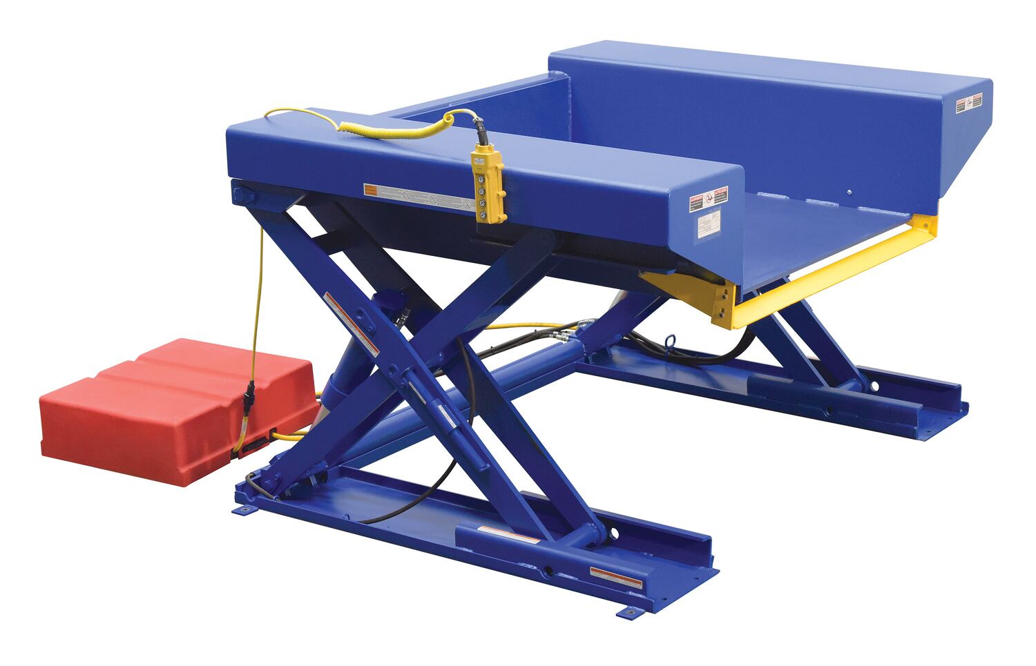 Steel Electric Hydraulic Ground Lift Table with Tilt 44 In. x 52 In. 4000 Lb. Capacity BlueA ground lift and tilt table is designed to lift or tilt products to an ergonomic working position, reducing operator bending. Products may be loaded and unloaded with the use of a standard hand pallet truck. There is no pit mounting required. Lift and tilt is controlled separately. A remote power unit with hand-held control is standard.