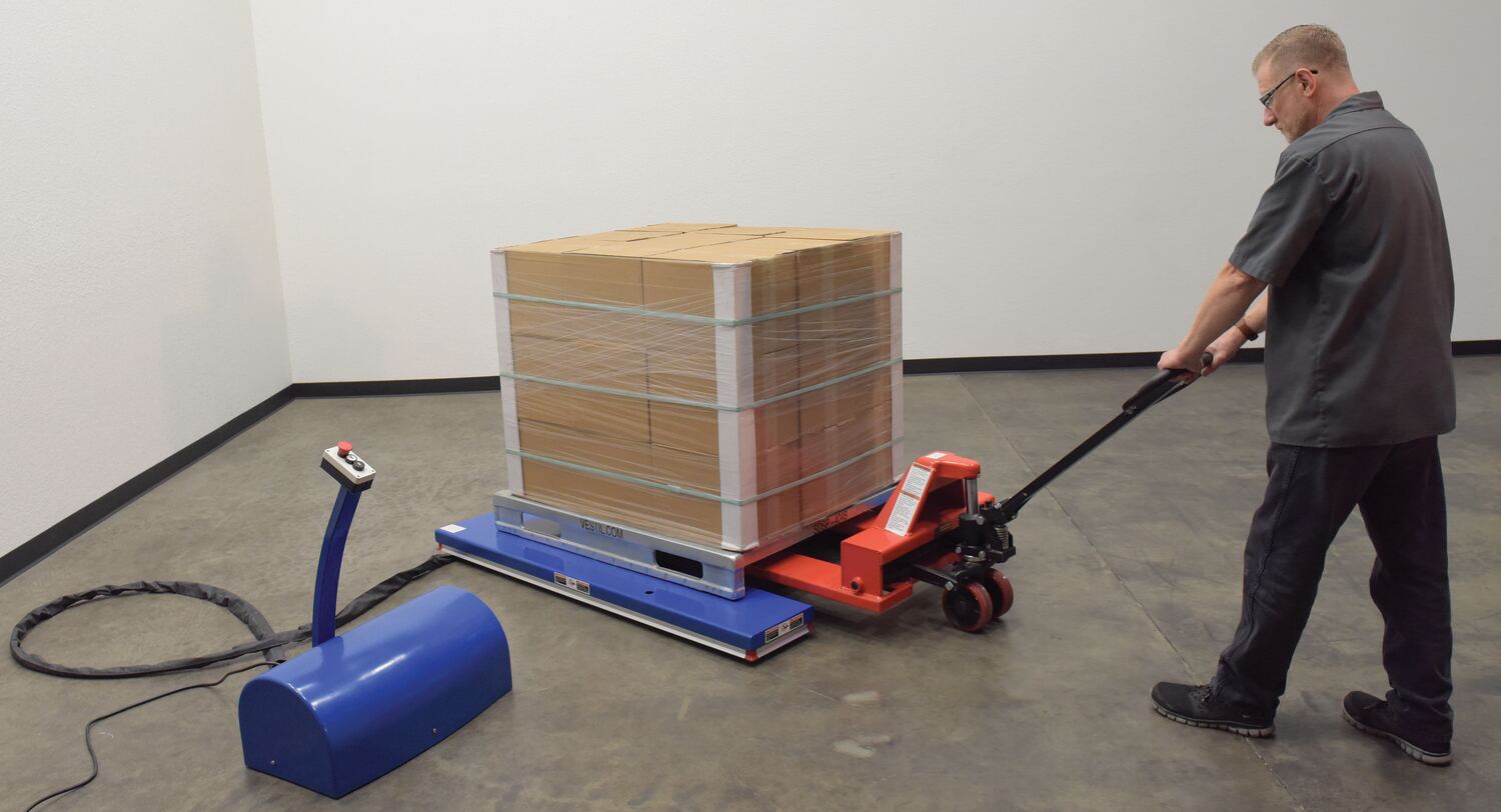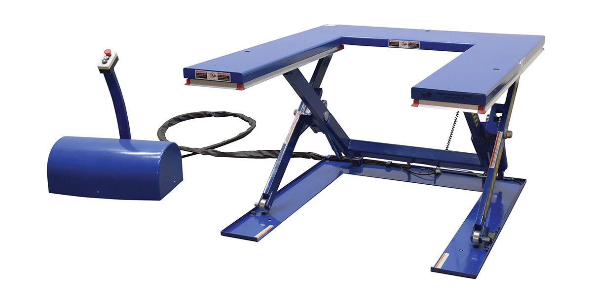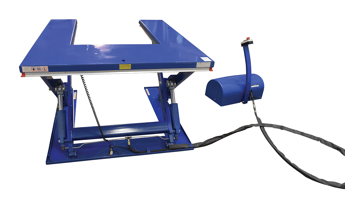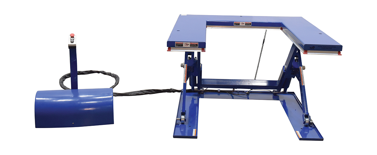 The low profile electric lift tables with the unique, steel constructed, "U" design provides an open center that enables a pallet truck to place a load on the platform. This lift table features an external power pack equipped with a pressure relief valve that prevents overloading and a flow control valve that controls the lowering speed. The remote power pack comes complete with a cover to protect the motor from dust and debris. The up and down push button raises and lowers the unit and is located on the control box. Safety features include toe guards, velocity fuse in cylinders, safety maintenance props, and an emergency stop button on the control box. The power supply has pedestal mounted push buttons. When using a pallet truck in conjunction with model, only open bottom pallets are to be used.