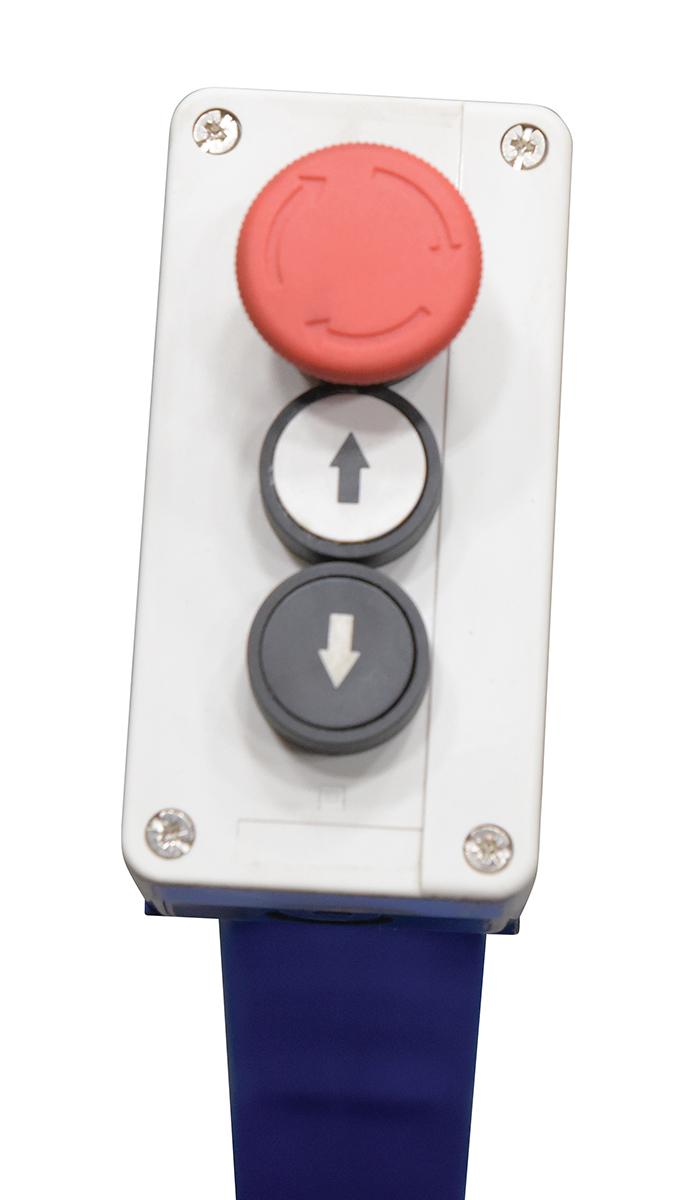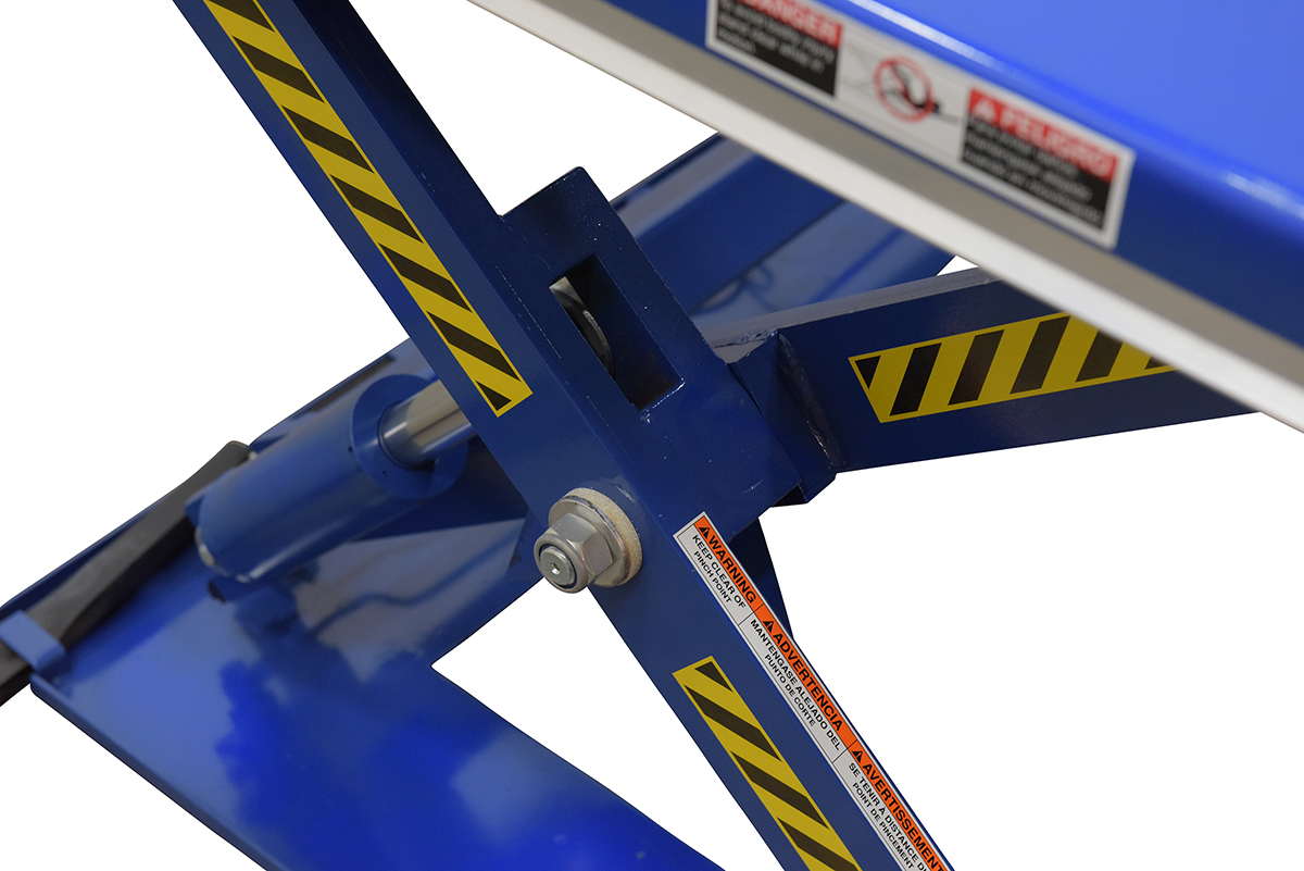 Steel U Type Electric Lift Table 3000 Lb. Capacity BlueThe low profile electric lift tables with the unique, steel constructed, "U" design provides an open center that enables a pallet truck to place a load on the platform. This lift table features an external power pack equipped with a pressure relief valve that prevents overloading and a flow control valve that controls the lowering speed. The remote power pack comes complete with a cover to protect the motor from dust and debris. The up and down push button raises and lowers the unit and is located on the control box. Safety features include toe guards, velocity fuse in cylinders, safety maintenance props, and an emergency stop button on the control box. The power supply has pedestal mounted push buttons. When using a pallet truck in conjunction with model, only open bottom pallets are to be used.