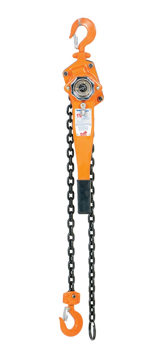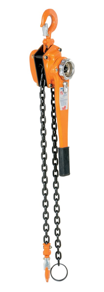 Steel Economy Lever Hoist 5 Ft. Chain Length 3000 Lb. Capacity OrangeThe economy lever hoist is ideal for lifting and pulling applications. It features a completely enclosed Weston-type automatic brake system for precise load positioning. This hoist is constructed from cold-formed stamped steel, which confers great strength, impact resistance and long product life. Durable baked enamel paint shields non-wearing parts from environmental damage. Single-hand "free chaining" is simple and convenient allowing smooth, trouble-free operation in the vertical or horizontal position. Both the swivel hooks include deformation indicators. Every chain hoist is issued with an individual test certificate.