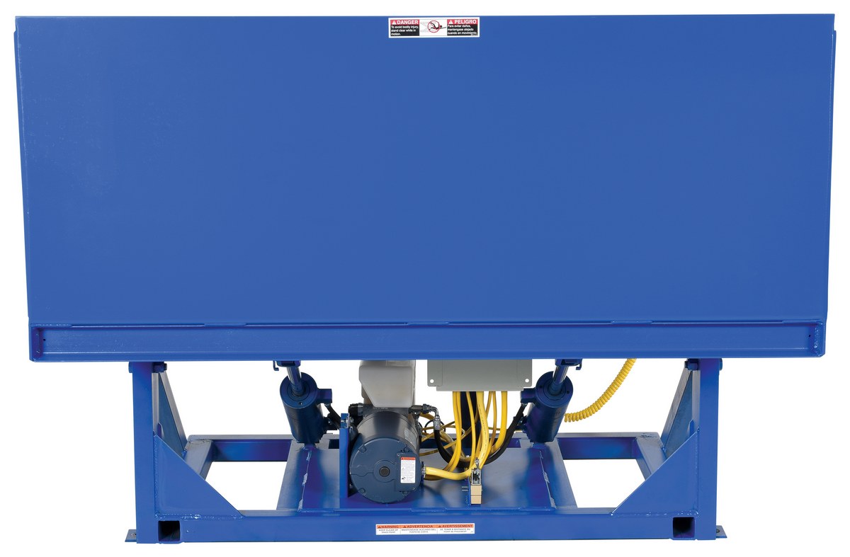 Steel Efficiency Master Tilt Table 90 Degree Tilt 60 In. x 50 In. 6000 Lb. Capacity BlueThe efficiency master tilt table tilts pallets, crates, boxes, or baskets to facilitate easy container loading or unloading. The table features all welded steel construction for years of durability. The unique design minimizes pinch points to meet OSHA requirements. It's ideal for upending products in shipping and receiving operations. The unit is equipped with an industrial quality motor that delivers the best torque with minimal amperage draw for maximum life. Standard voltage is 460/3PH with additional voltage options available. The tilt table has a standard push button hand control with a double acting cylinder for controlled tilt and return. The unit must be lagged to the floor.