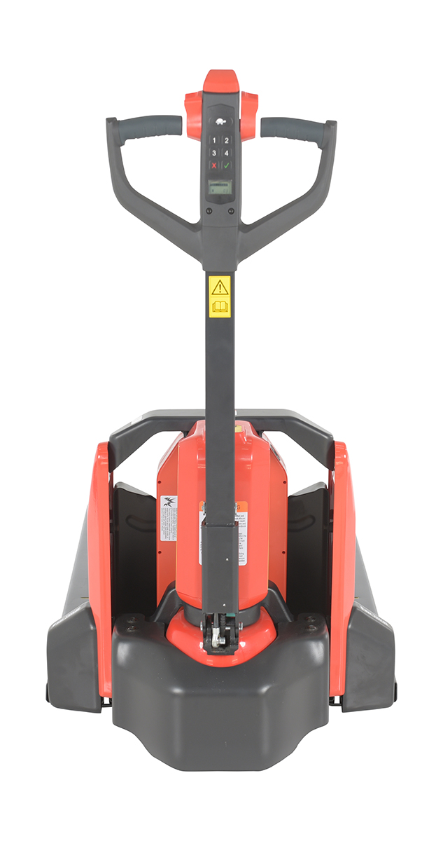 The electric pallet truck is the perfect change from the manual design. This construction design is built to last, withstand rugged daily use, and diminish manual labor. Multi-function capabilities like the raise lower buttons and emergency brake are located in the handle. All areas are easily accessible for general upkeep and cleaning. Truck can be used with the handle in the upright position for utilization in the small areas. Horn is also included.