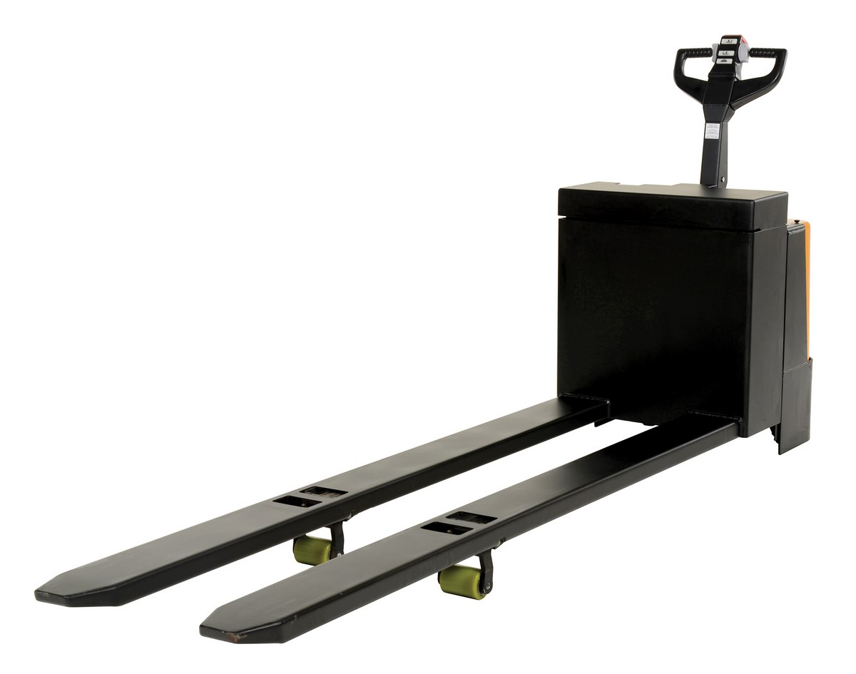 Steel Electric Pallet Truck with AGM Batteries 27 In. x 96 In. 4500 Lb. CapacityThe fully powered electric pallet truck has an easy and quick operation. The unit raises and lowers loads with a push of a button. It can maneuver loads in warehouses and trailers. The reinforced welded forks have adjustable tie-rods that provide long service. The high-torque DC drive and lift motors handle heavy-duty jobs. Unit includes integral battery charger, battery level gauge, and emergency battery disconnect. The truck rolls smoothly on poly-on-steel, steer and load wheels. Ergonomic handle features easy to operate throttle with infinite adjustment of forward and reverse speeds, lift/lower controls, proprietary safety-enhancing emergency reverse function, and horn. When the proprietary safety-enhancing emergency reverse function is actuated, the emergency reverse belly switch instantly reverses direction and moves the unit forward (away from the operator) until the switch is released or after 1.5 seconds have elapsed. The built-in safety circuit will automatically disable the entire unit if the emergency reverse belly switch is activated for more than 1.5 seconds after which the unit must be re-set to return to normal operating conditions. This state-of-the-art safety device provides a high degree of operator protection. Includes an electromagnetic disc brake with automatic dead-man feature that activates when the user releases the handle. Also includes a stand-on platform, which flips up when not in use.
