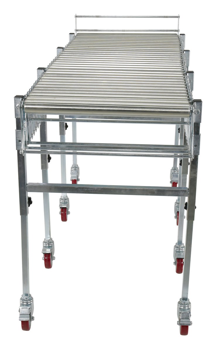 Steel Expandable Conveyor Roller 200 Lb. Capacity SilverExpandable roller conveyor is the perfect asset for packaging and distributing facilities. The conveyor provides the user an ergonomically friendly way to transfer goods while minimizing the bending and twisting during shipping and handling. A strong construction provides strength for transferring large awkward products. The conveyor can be expanded to reach greater distances between packaging points. Once finished it can be retracted to fit in a condensed area.
