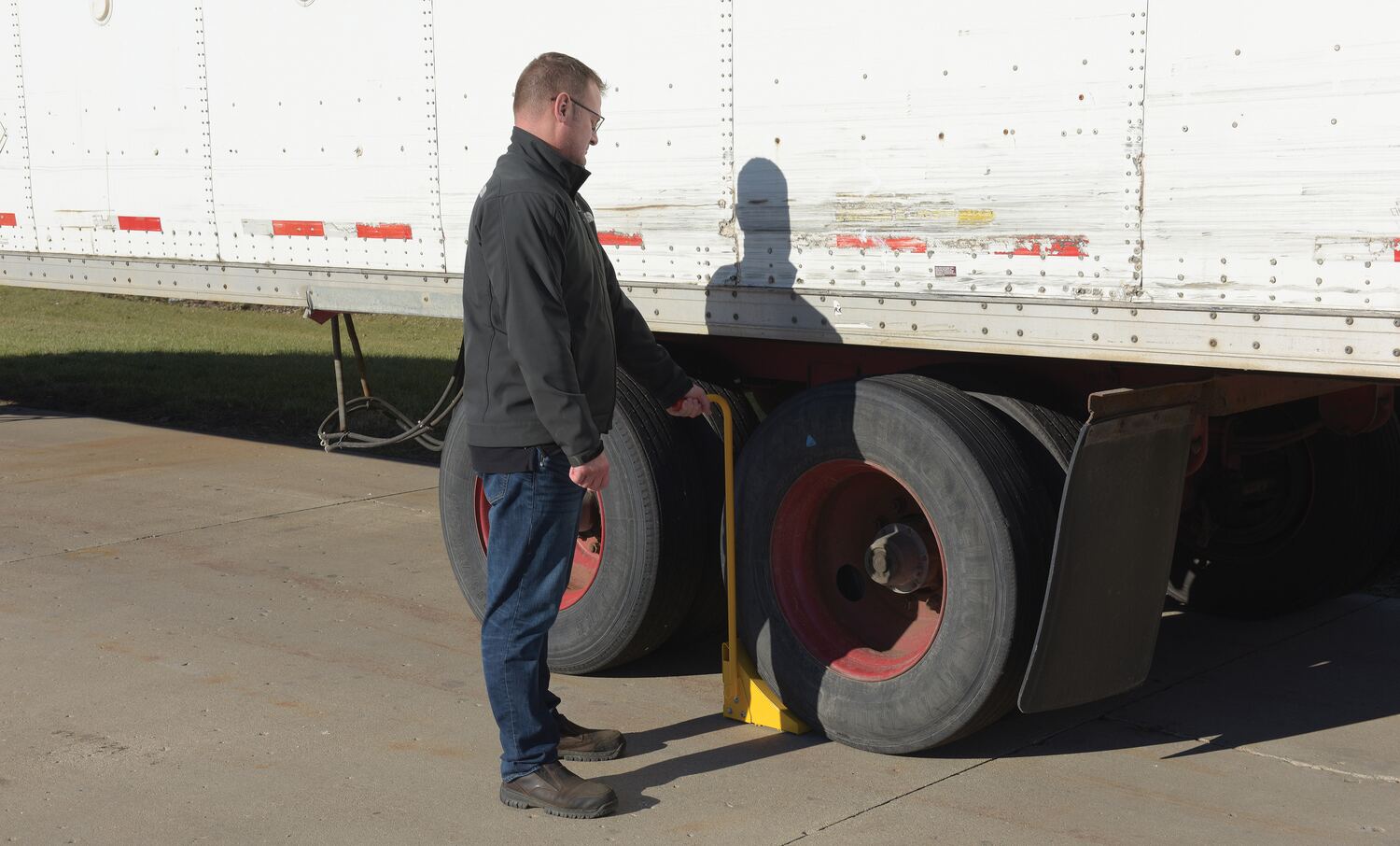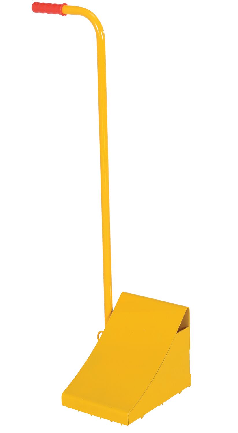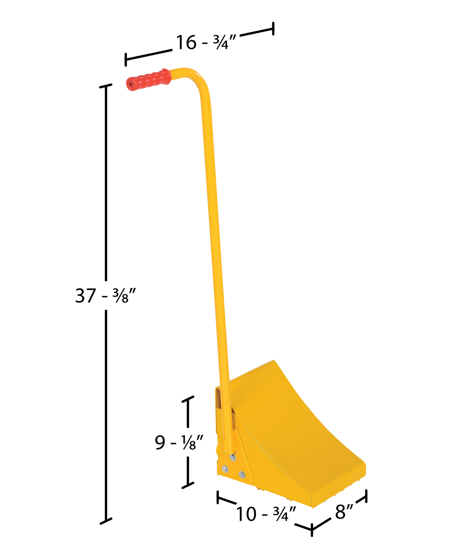 Fabricated Steel Wheel Chock With Ergonomic Handle 10-3/4 In. Length YellowThe fabricated ergo-handle Wheel Chock has an ergonomically design that makes it easy to move wheel chocks in and out of position under trailer wheels. It reduces the risk of back, knee, and foot injuries. The handle is constructed of steel and includes a yellow powder coat finish. Assembly required. D-ring provided for attaching security chain. Chain not included.