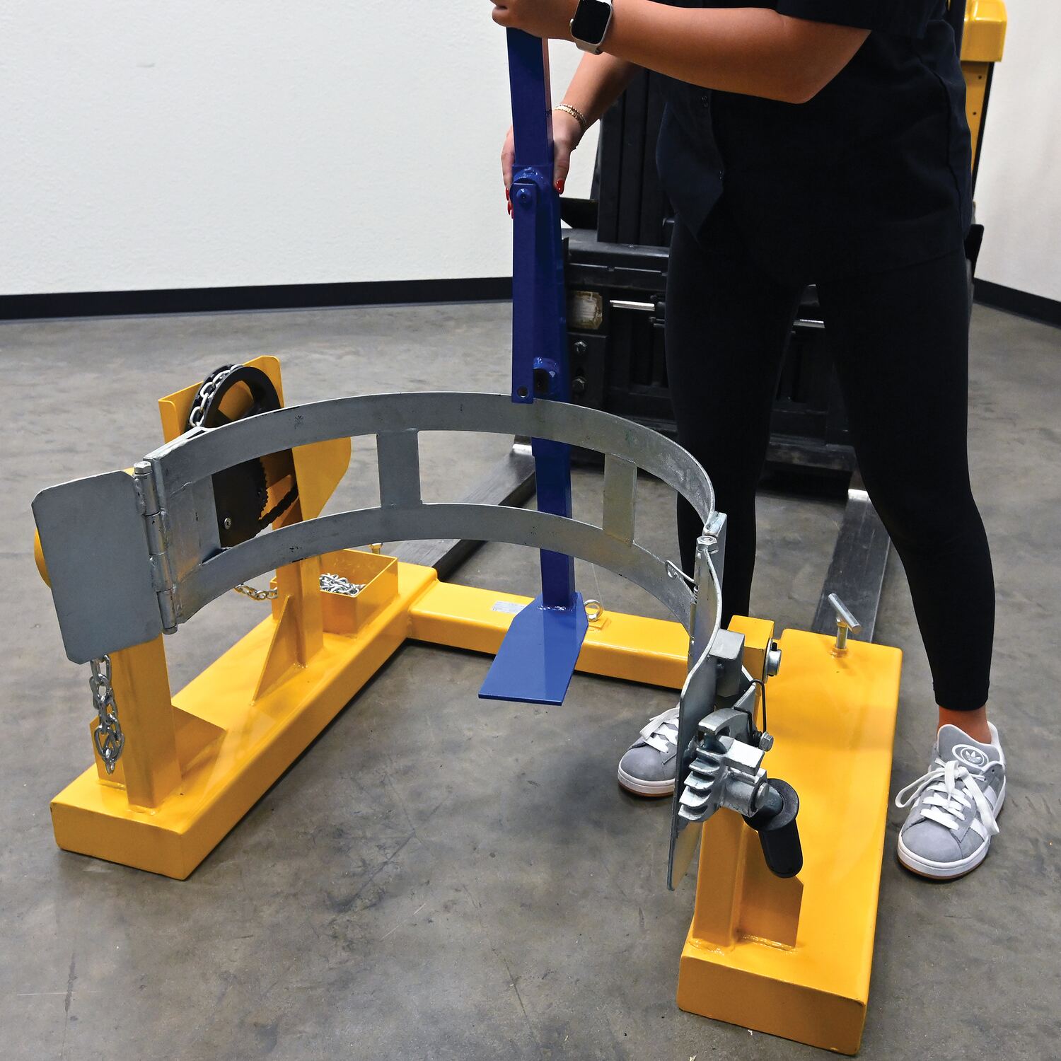 Steel Fiber & Plastic Drum Adapter Carrier/Rotator For 30 Gallon and 55 Gallon Drums BlueThis fiber drum adapter is designed to hold and support fiber and plastic drums. Comes complete with both an adjusting arm and a high strength nylon strap so thirty (30) gallon and fifty-five (55) gallon drums can be used with listed stackers and carrier/rotators.