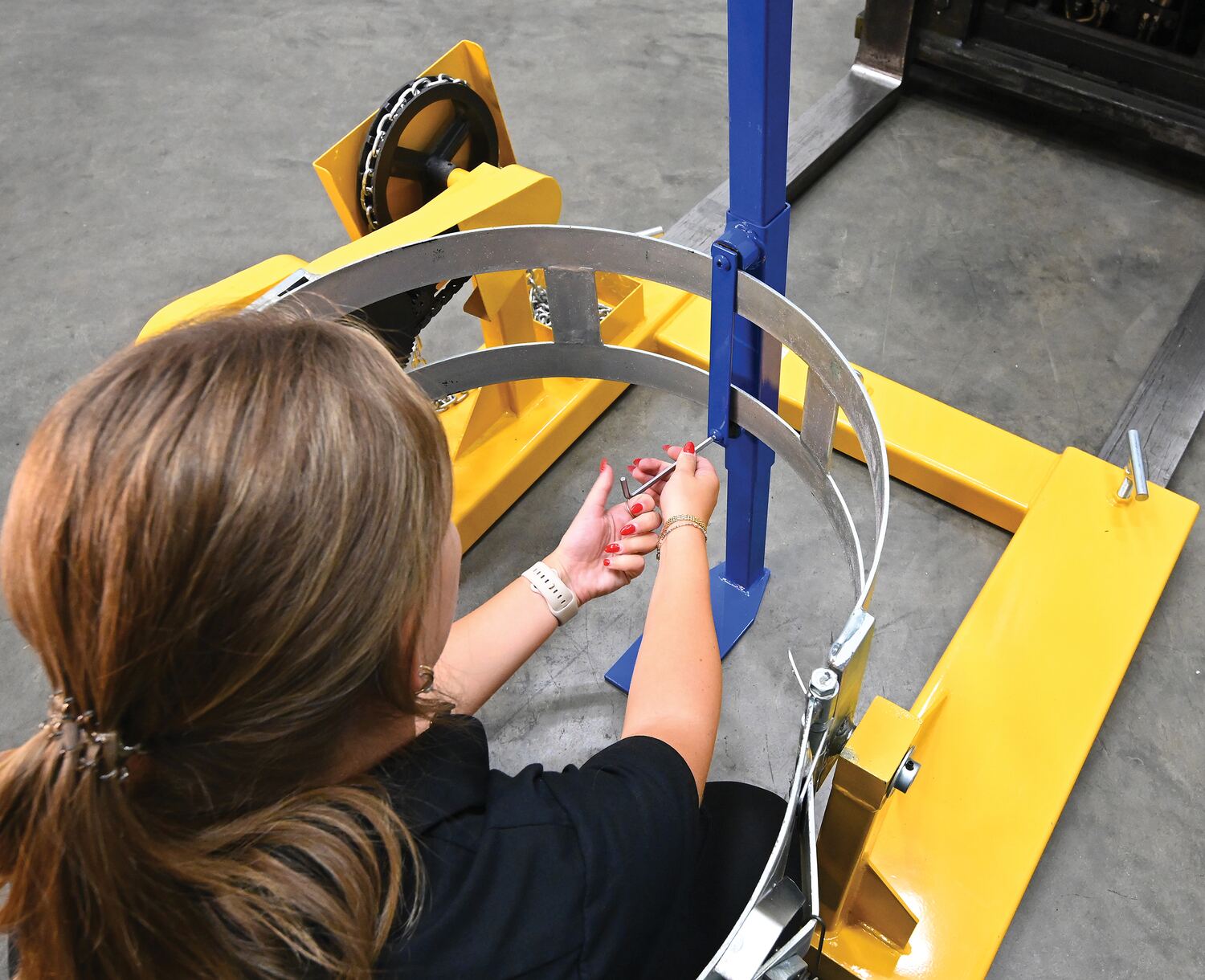 This fiber drum adapter is designed to hold and support fiber and plastic drums. Comes complete with both an adjusting arm and a high strength nylon strap so thirty (30) gallon and fifty-five (55) gallon drums can be used with listed stackers and carrier/rotators.